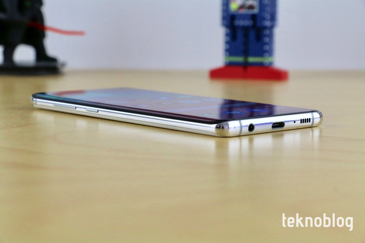 Kenarları çevreleyen metal çerçeve, iki uzun kenarda biraz daha ince bir görünüm olarak telefonun normalden daha ince görünüyormuş hissi yaratmasını sağlıyor. Arkadaki cam panel de ön yüzle simetrik bir görünüm oluşturarak kenardaki çerçeveyle buluşuyor. Alt kenarda USB-C portu, mikrofon ve hoparlör var. 3.5mm kulaklık jakını görmek de birçok kullanıcıyı memnun edecektir. Üst kenarda ikinci mikrofon ile nanoSIM ve microSD kart tepsisini görüyoruz.