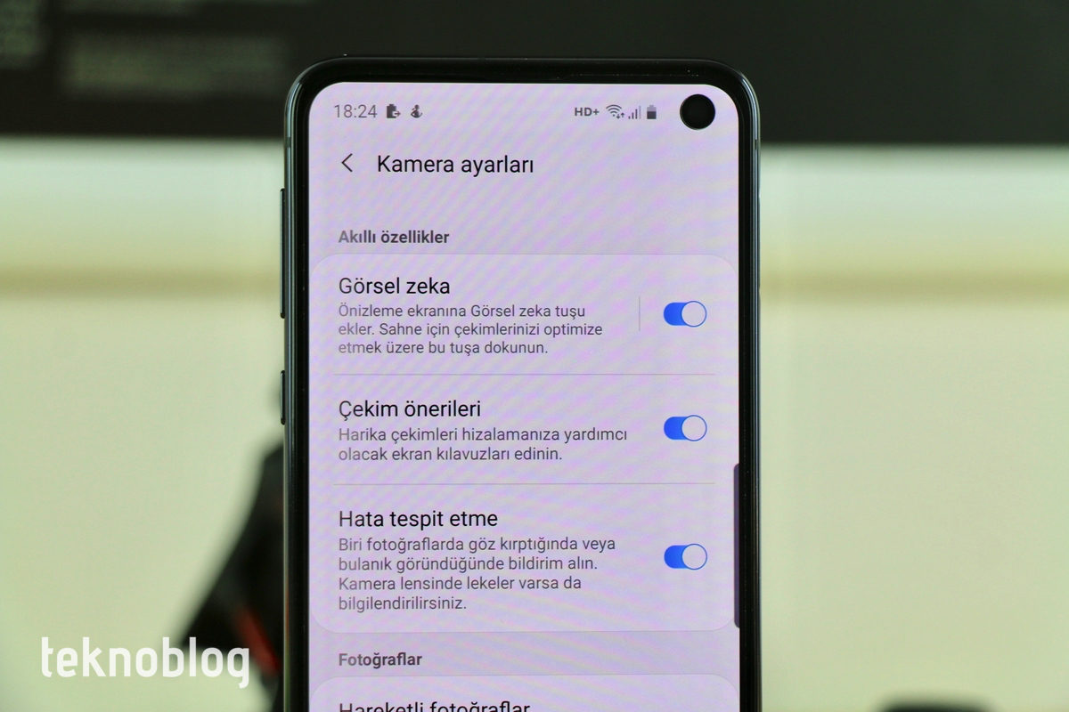 Samsung, daha büyük ekranlarda yer verdiği teknolojileri S10e’nin ekranına da yerleştirmiş. Bu ekran da Dynamic AMOLED teknolojisine sahip. Derin siyahları, canlı renkleriyle hem kullanıcı arayüzü, hem fotoğraflar hem de videolar etkileyici görsellikte sunuluyor. HDR10+ desteği de ekranın önemli artılarından bir tanesi. YouTube’daki bazı HDR videolarıyla test ettiğimiz zaman bu teknolojinin farkını görüyoruz. Ekran karanlık sahnelerde bile detayları seçmemize yardımcı oluyor. AMOLED teknolojisi dışarıda, parlak ışık altında da ekranın rahat bir şekilde görünmesine yardımcı oluyor. Öte yandan S10e’nin ekranı mavi ışık salınımını yüzde 42 oranında azaltıyor. Bu da gece vakti S10e’yi kullanırken uykunuzun kaçmasını engelleyecektir, gözleriniz daha az yorulacaktır.