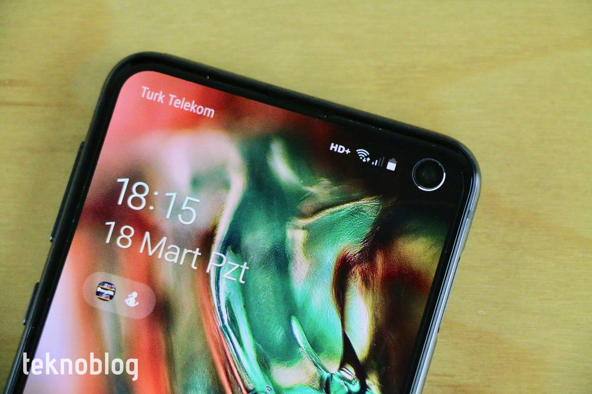 Ekran camından ekrana geçelim. Galaxy S10e’de 5.8 inçlik köşeden köşeye uzunluğa sahip ekran yer alıyor. Ekran, telefonun köşelerine uyumlu biçimde kavis yaparak telefona biraz daha hoş bir hava katıyor. Bu ekranın etrafını, serinin diğer üyelerininkine oranla daha kalın, ancak yine de ince olarak nitelendirebileceğimiz bir çerçeve sarıyor. Ekranın alt kenarındaki çerçeve alanı diğerlerine göre biraz daha kalın. Üstte ise ahize hoparlörü küçük bölüme yerleştirilmiş. Selfie kamerası ise, diğer üyelerde olduğu gibi ekranın içine yerleştirilmiş. Ekranın sağ üst köşesinde gördüğünüz küçük kamera deliği başlangıçta biraz garip gelebilir. Ancak zaman geçtikçe buna alışacağınızı söyleyebiliriz. Samsung da bu deliğin dikkat çekmemesi için genel olarak üst kısmı koyu tonlarda olan duvar kağıtları kullanıyor. Üstelik bazı ilginç Galaxy S10 duvar kağıtları da kamera deliğinin rahatsız edici olmasının önüne geçiyor. Bu arada Samsung, bu kamera deliğini biraz daha ilginç gösterecek bazı yazılım detaylarına da başvuruyor. Örneğin ekran kilidini yüzünüzle açarken kamera deliğinin etrafında halka biçiminde bir animasyon görülüyor.
