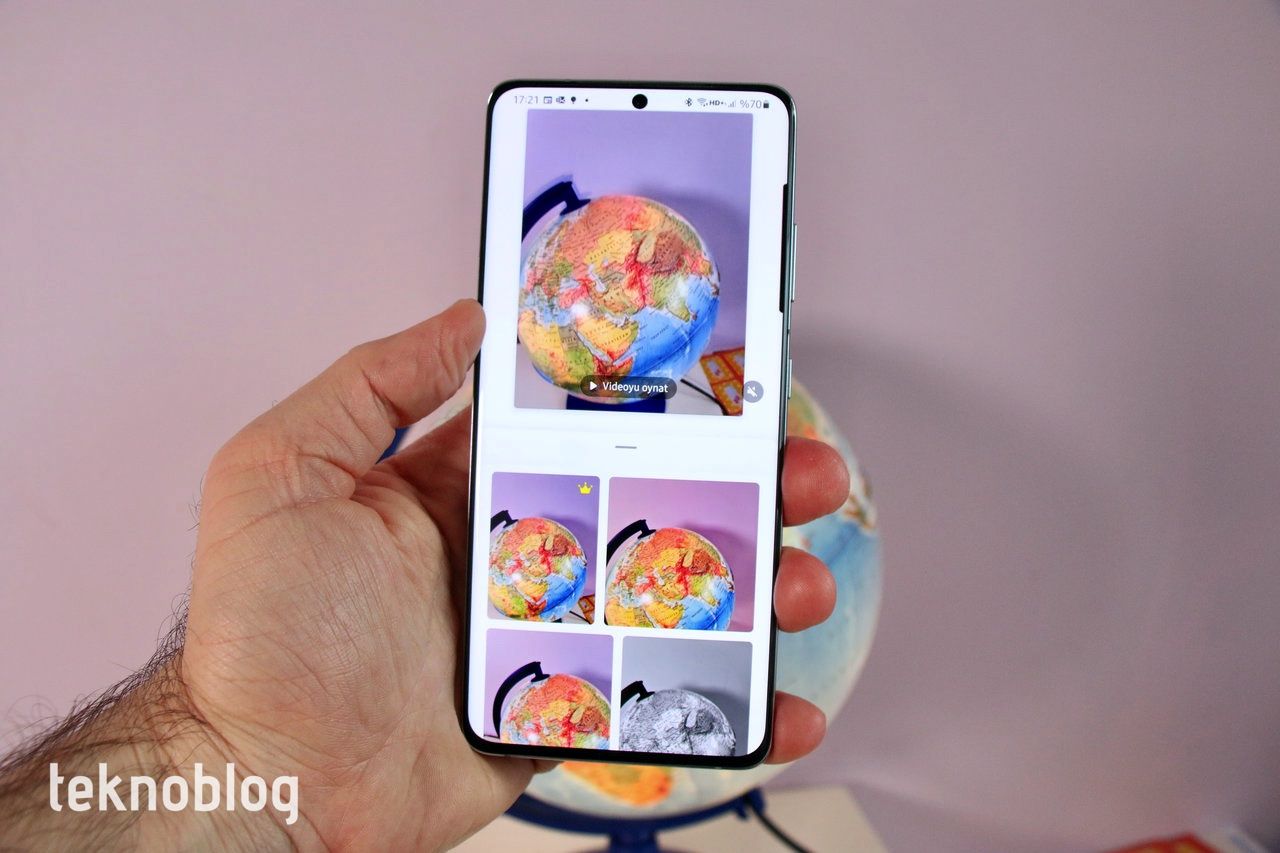 Öte yandan geçen yıl S20 ile ilk kez gördüğümüz Pro Video modları da var. Bu sayede video çekimlerinde beyaz dengesi, pozlama ve benzeri ayarları çekim öncesinde veya sırasında gerçekleştirebilirsiniz. Galaxy S21 ailesiyle birlikte eklenen yeni bir video özelliği ise Yönetmen Görünümü oluyor. Bu görünümde ön ve arka kameraların hepsi kullanılıyor, vizör ekranında tüm kameraların görüntülerini görüyorsunuz. Arkadaki kameraların ön izlemelerini görerek istediğinizi seçebilir ve o kameranın açısıyla çekimin yapılmasını sağlayabilirsiniz. Bu esnada ön kamera çekimini de ekranda tutabilirsiniz. Özellikle özel günlerde yapacağınız çekimlerde bu Yönetmen Görünümü modu kullanışlı olabilir. Aynı zamanda vlog çekenler için de bu mod işe yarayabilir.
