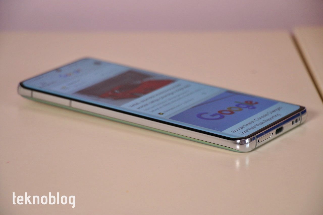 Samsung’un Galaxy S serisi içindeki telefonlar, daha yuvarlak köşeleriyle biraz daha sıcak bir havaya sahiptir. S21 Ultra’da da durum aynı şekilde. Bu kavise sadece arka yüzde kenarlara doğru yapılan kavis değil, ön tarafta ekranın kenarlara doğru yaptığı kavis eşlik ediyor. Ne var ki, ekranın uzun kenarlarında yaptığı kavisin açısı, S10 Plus gibi daha eski amiral gemisi Samsung telefonlarına göre sınırlı kalıyor. Bu durum bir açıdan iyi, tek elle kullanırken yanlışlıkla ekranın kenarlarına fazla temas edip istenmeyen komutların önüne geçiliyor. Ekrandaki kaviste fazla abartıya kaçılmaması, arka yüzün kavisinin de aynı oranda tutulmasını ve kenar profilinin biraz daha kalın olmasını sağlıyor.