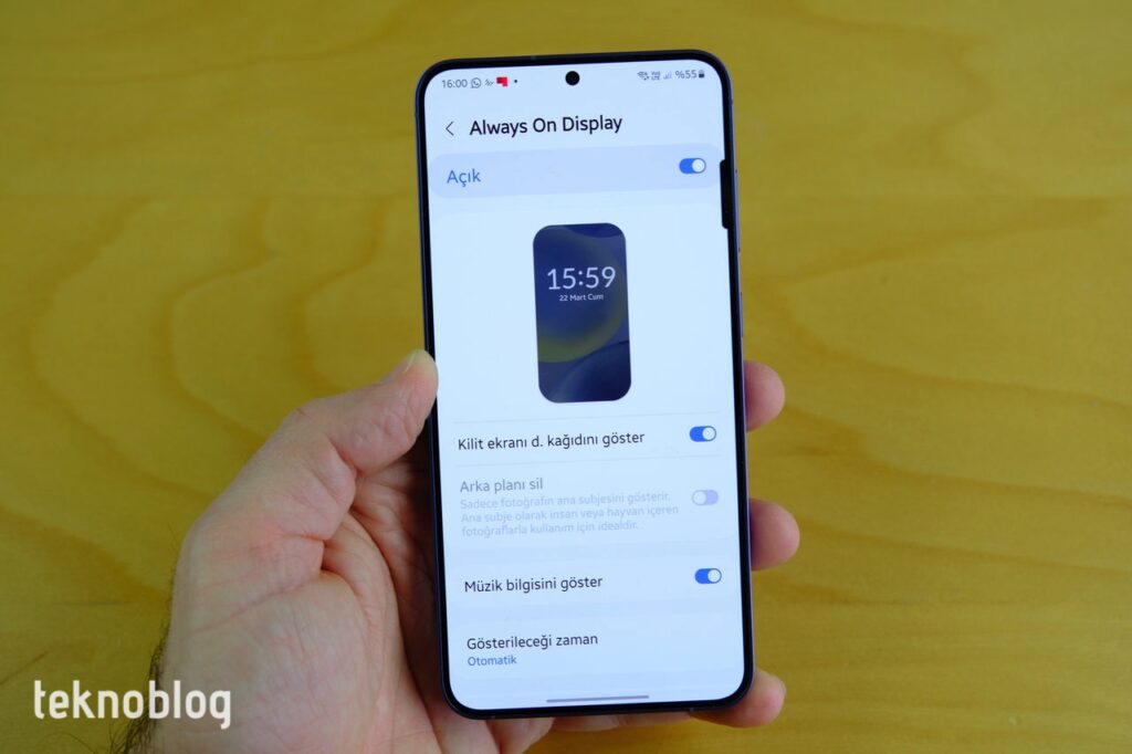 Ekran yenileme hızı en fazla 120 Hz’e kadar çıkıyor. Ekran, LTPO teknolojisine sahip olduğu için yenileme hızını dinamik olarak çok düşük seviyelere indirmek mümkün. Ekranın sahip olduğu bu teknolojiler, Always-on display olarak adlandırılan sürekli açık ekran özelliğinin verimli ve pil ömrüne olumsuz etkide bulunmadan kullanılmasına izin veriyor. Tıpkı iPhone 14 Pro ve 15 Pro modellerinde olduğu gibi, ekranın parlaklığı büyük oranda kısılıyor, kilit ekranındaki bileşenleri, duvar kağıdıyla birlikte ekranda görmeye devam edebiliyorsunuz. Bu yeni sürekli açık ekran görünümüne ek olarak, eski tarz Always-on display görünümünü de tercih edebilirsiniz.