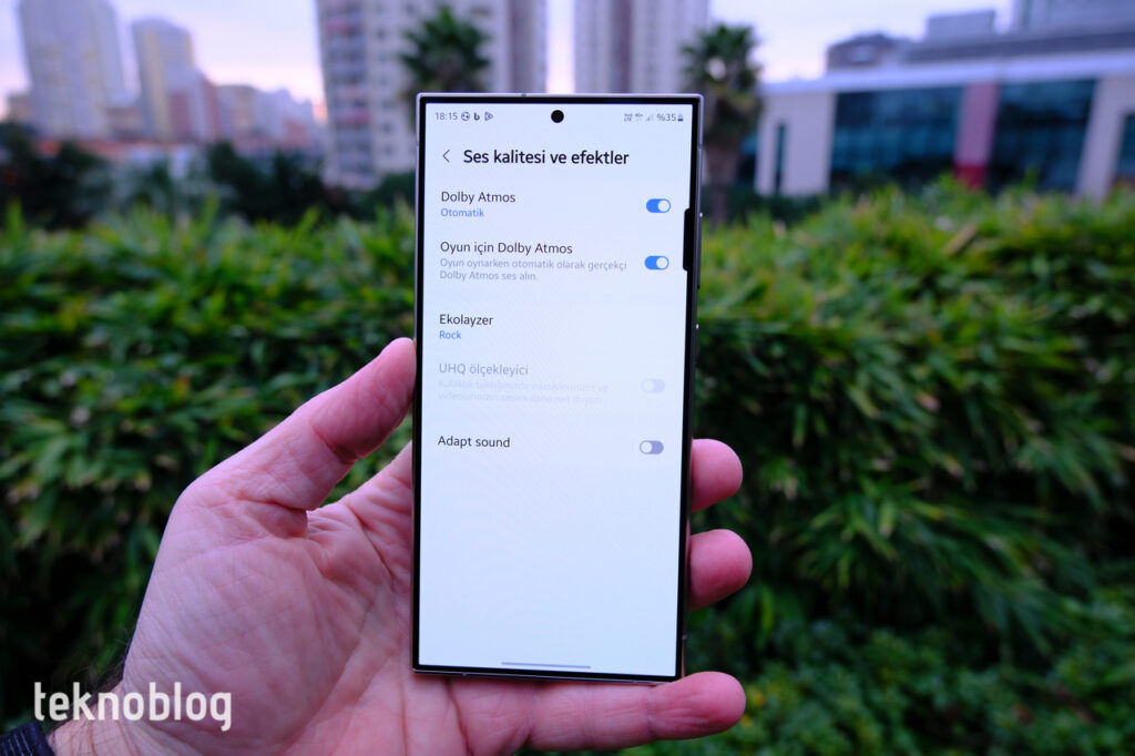 Ses tarafına geldiğimizde, Samsung Galaxy S24 Ultra da, bir en tepe amiral gemisi telefonundan beklenen ses seviyesini ve kalitesini sunuyor. Alt kenara ve ekranın üst kısmında, ince ve uzun ahize bölümüne yerleştirilmiş toplam iki hoparlör bulunuyor. Ses çıkış şiddeti fazlasıyla yüksek. Dolby Atmos’un da katkılarıyla müzik dinlerken veya video izlerken dolgun ve çevresel etkisi yüksek bir ses çıkışı sağlanıyor. Baslar da hissedilir derecede. En yüksek ses seviyesinde ise tizlerin rahatsız ediciliği söz konusu değil. Samsung ses ayarlarını olabildiğince sade tutmuş. Dolby Atmos ve oyun için Dolby Atmos seçeneklerinin yanında Ekolayzer da bulunuyor. Rock, Pop gibi çeşitli ön ayarların yanında 9 kanallı ayar da mevcut.