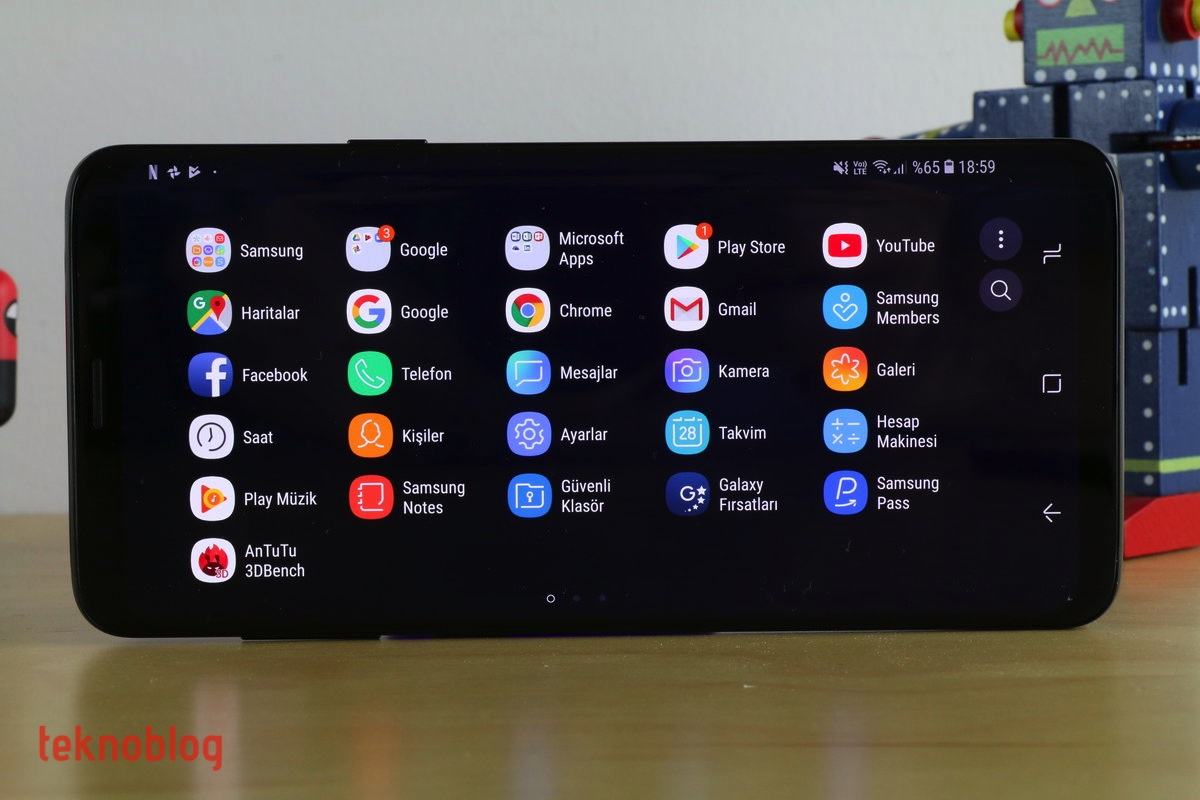 Son birkaç yıldır gördüğümüz her Samsung Android telefonunda olduğu gibi; Samsung, Google ve Microsoft klasörleri yine mevcut. Samsung’un epey uygulaması yüklü olarak geliyor. Smart Things, Samsung Health, Dosyalarım gibi uygulamalar bunlardan başlıcaları. Google’ın da Gmail, YouTube, Drive, Fotoğraflar gibi uygulamalarını görüyoruz. Microsoft’un da Word, Excel, PowerPoint, OneDrive ve LinkedIn uygulamaları hazır şekilde bekliyor. Tabii ki, bu yoğunluk aynı işi gören birden fazla uygulamanın olmasına yol açıyor. İki adet internet tarayıcısı, iki adet galeri, iki adet e-posta uygulaması Galaxy S9+’da mevcut. Neyse ki, Samsung yüklü olarak gelen uygulamaları kaldırma imkanını tanıyor.