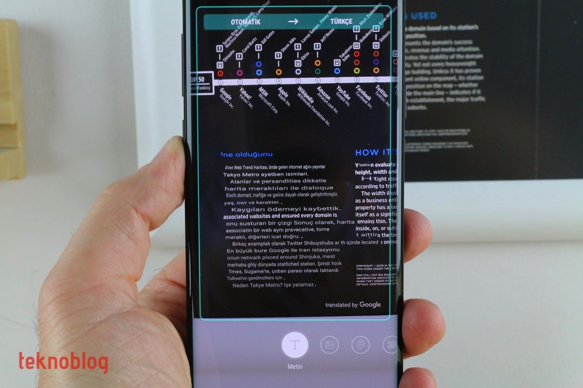 Bixby Vision olarak adlandırılan görsel özelliklere ise kamera uygulaması içinden erişiliyor. Kamera uygulamasını açtığınızda, sol alt köşede Bixby Vision ikonunu göreceksiniz. Nesne tarama ve benzer resimleri Pinterest üzerinde bulma imkanı yine mevcut. Ancak Bixby Vision’ı daha fazla kullanmanızı sağlayacak, teşvik edici özellik ise bu yıl eklenen görsel çeviri oluyor. Google’ın Çeviri uygulamasına benzer şekilde, Bixby Vision’ı açıp kamerayı herhangi bir yazılı noktaya tuttuğunuzda, yazılar otomatik olarak çevriliyor. Ya da metin taraması yapılıyor, metin ayıklanıyor ve bunun üzerinden çeviri gerçekleştiriliyor. Servis Google Çeviri’yle bağlantılı biçimde çalışıyor. Özellikle yurt dışı seyahatlerinde epey kullanışlı olacaktır. Ancak çalışması için internet bağlantısı gerekiyor.