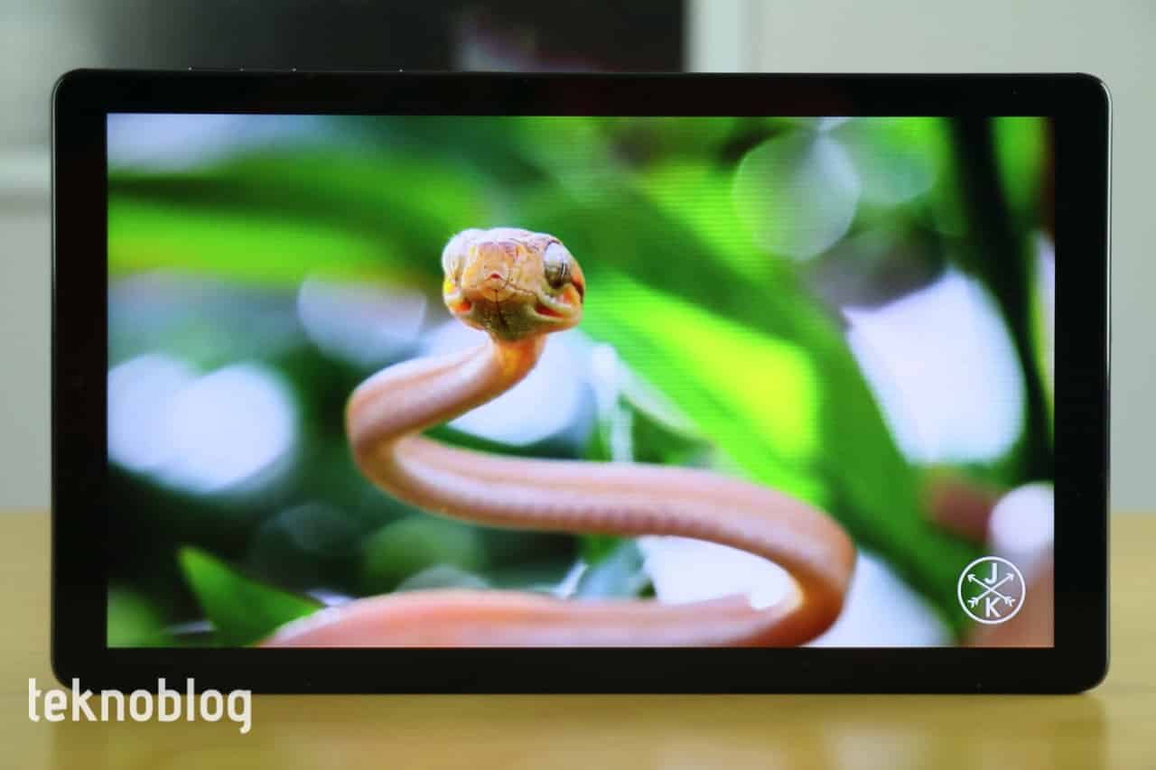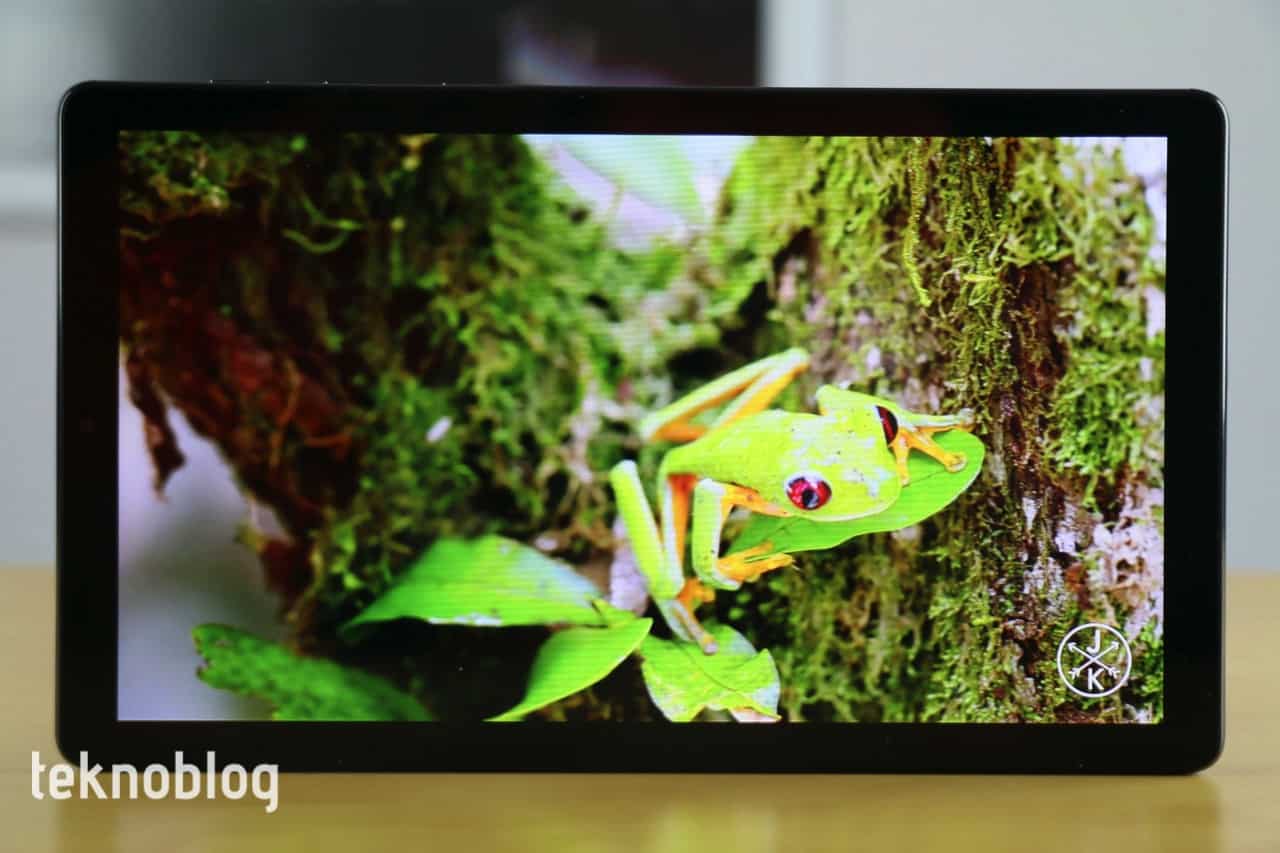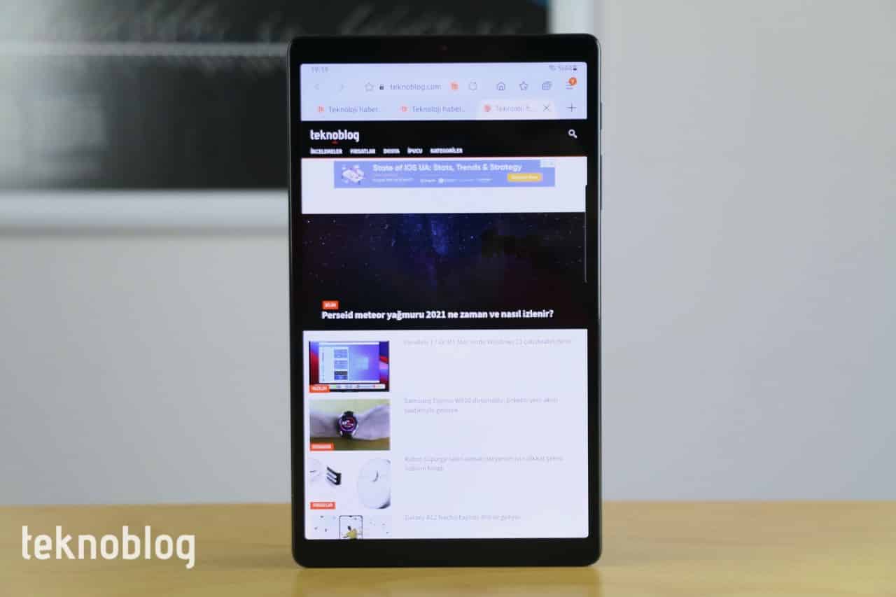 Galaxy Tab A7 Lite’ın ekranı 8.7 inçlik köşeden köşeye uzunluğa sahip. Bu ekran TFT teknolojisine sahip ve 800 x 1340 piksel çözünürlük ve 179 ppi piksel yoğunluğu değerlerini barındırıyor. Çok mükemmel bir görsel deneyim beklemeyin, ancak fiyatına göre tatmin edici olduğunu rahatlıkla söyleyebilirim. Ekran parlaklığı yeterli, dışarıda parlak ışık altında da tableti kullanmayı sağlayacaktır. Adaptif parlaklık özelliği sayesinde ekran parlaklığı ortamdaki ışık şiddetine bağlı olarak otomatik olarak ayarlanabiliyor. Ekrana yanlardan baktığınızda parlaklık azalıyor ve görüntü kalitesi indirgeniyor olsa da, ekranda neler olup bittiğini görmeye devam ediyorsunuz. Ekrana dikkatli biçimde baktığınızda pikselleri fark edersiniz, ancak yazıların keskinliği ve netliği açısından sıkıntı yaratacak bir durum yok. Aynısı resimler ve grafikler için de geçerli.