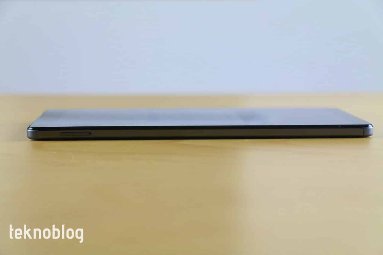 Yukarıda da belirttiğim gibi, Galaxy Tab A7 Lite, geçen yılın A7 modelinin bir “lite” versiyonu. Bu tanım tabletin boyutları için fazlasıyla geçerli. Boyutları ve ağırlığı azaltılmış olsa da, 8 milimetre ile daha büyük tabletin 7 milimetrelik gövde kalınlığının üstüne çıkıyor. 8.7 inç ekranın kenarlarını saran çerçeve ince sayılır, bu sayede yüzde 81.1 gibi bir ekran-gövde oranına ulaşılıyor. Bu sayede bir şeyler okurken veya izlerken tek elle tutmakta sıkıntı yok. 366 gramlık ağırlığıyla da bu boyuttaki bir tablet için makul sınırlarda yer alıyor. Çantada rahatlıkla taşıyabilirsiniz, ancak cebe sığdırmak mümkün değil. Ancak kış gelip de ceket giymeye başladığınızda yan ceplerde rahatlıkla taşırsınız.