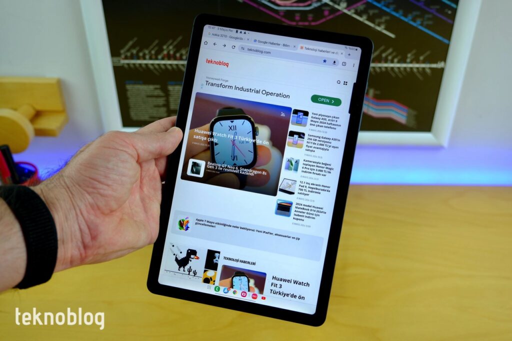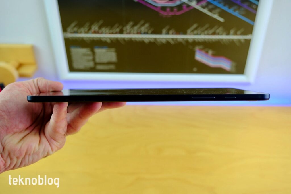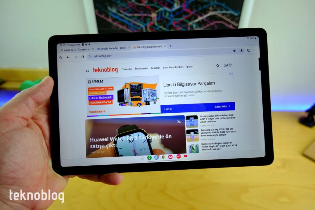 Galaxy Tab S6 Lite’ın 10.4 inç ekranı da seleflerinin niteliklerini koruyor. Yine TFT LCD ekran var, içeride ve dışarıda kullanım için yeterli bir parlaklık mevcut. 1200 x 2000 piksel çözünürlük de bir tablet için iyi seviyede keskinlik ve netlik sağlıyor. Nispeten kalın çerçeveleri tableti tutarken ekrana yanlışlıkla temas etmenin önüne geçiyor. Özellikle düşey yönde tutuşta web’de gezinme, X gibi sosyal medya uygulamalarını kullanma gibi işler için bu ekran yeterli. Yatayda ise, 5:3 görüntü oranlı ekranın YouTube videoları veya Netflix, Disney+, Amazon Prime video içerikleri için elverişli olduğunu görüyoruz. Ses tarafında da bu tablet, fiyatına göre fazlasıyla güçlü.