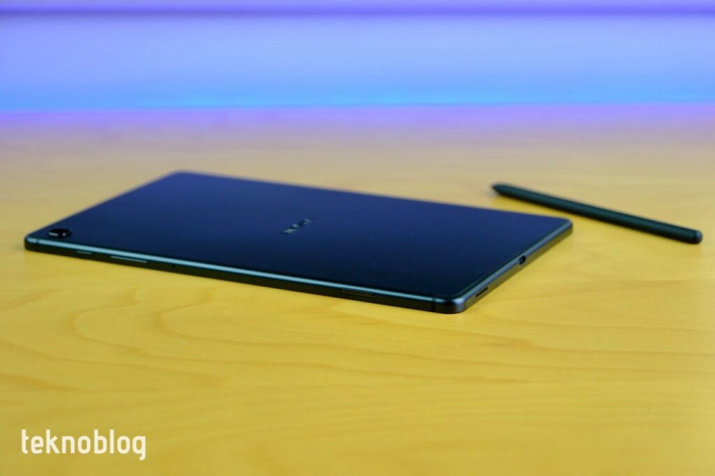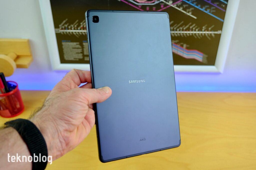 Tabletin tuş ve giriş yerleşimi de düşey oryantasyona göre yapılmış. Selfie kamerası ekranın kısa kenarında, bu nedenle görüntüde tam biçimde ortalanmak için ya tableti dik tutmalı ya da yatay tutuşta oturuşunuzu ona göre ayarlamalısınız. Dikey tutuşa göre alt kenarda USB-C portu, üst kenarda ses tuşu var. Yanda ise ses tuşları var. İki kısa kenara birer hoparlör yerleştirilmiş. Aynı zamanda kısa kenarda 3.5mm kulaklık jakı da var. Arkada 8 megapiksel tek kamera mevcut. Samsung ve AKG logoları arkadaki dizilimi tamamlıyor.