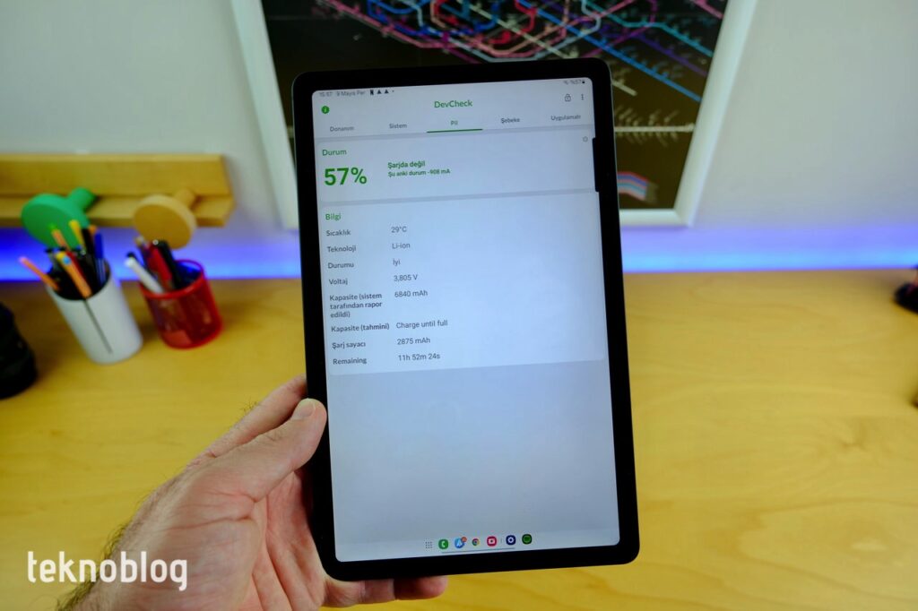 Tablet daha önce olduğu gibi yine 7040 mAh kapasiteli pille geliyor. 15W’lık şarj desteğiyle, 2 ila 2 buçuk saatlik bir sürede pil tamamen doluyor. Bu nedenle en güzeli tableti gece saatlerinde şarj etmek olacaktır. Kutudan güç adaptörü çıkmıyor, ancak telefonunuzun şarj adaptörü yeterli olacağı için bunun eksikliğini çekmezsiniz. Tablet, tek bir şarjla 5-6 saat arasında bir ekran süresi sunuyor. Bu da özellikle öğrenciler için, sabahtan akşama tek bir şarjla vakit geçirmek için yeterli olacaktır. Özellikle ev eğlencesi için kullanmayı düşünenlerin 2-3 günde bir şarj etmesi yetecektir.