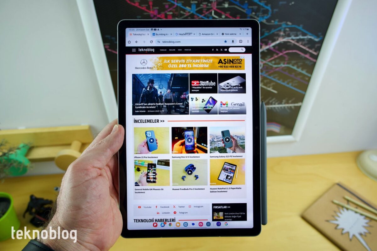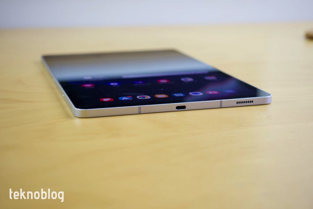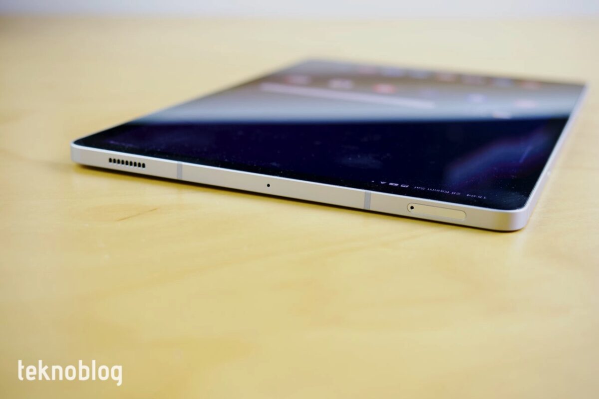 Yatay tutuşa göre konuşacak olursak, sağ kenarda USB-C portu, sol kenarda ise mikrofon ve microSD kart yuvası var. microSD kart yuvasını, nano SIM kart tepsileri gibi sivri uçlu bir cisimle açmak gerekiyor. Üst kısımda parmak izi okuyucusunun entegre edildiği güç düğmesi ve bunun hemen yanında ses tuşları var. Bu tuşlar dışa doğru fazla çıkıntı yapmasa da, el yordamıyla bulup kullanmak kolay. Yatay veya dikey tutuşta erişimde de sıkıntı yok. Derinlikleri de iyi biçimde ayarlanmış. Parmak izi okuyucu da hızlı çalışıyor, ancak tableti dikey biçimde tutarken bu birime erişip kullanmak daha rahat görünüyor. Yatayda ise tableti ters tutup sağ el baş parmağıyla parmak izi okuyucusunun entegre edildiği güç düğmesine doğal biçimde erişebiliyorsunuz. Diğer türlü, sol el işaret parmağınızı güç düğmesine doğru hareket ettirmelisiniz.