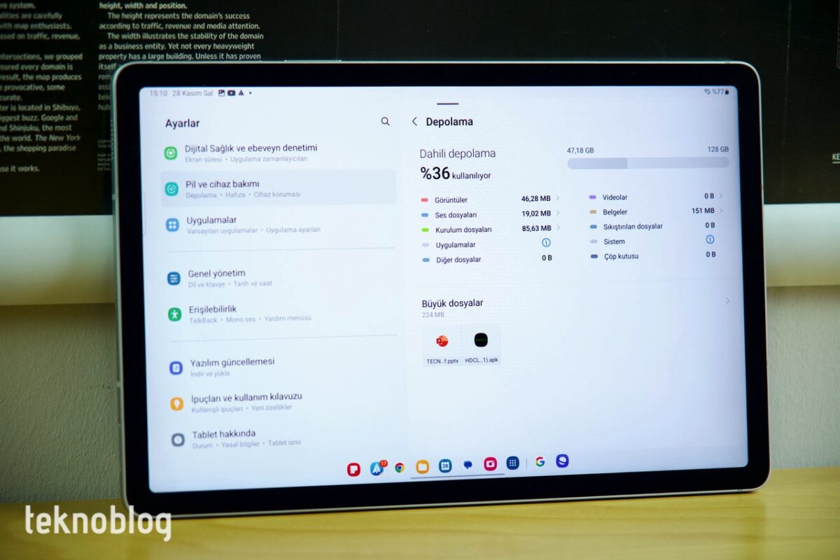 Samsung’un bu tableti, sahip olduğu donanım paketiyle günlük işler ve içerik tüketimi için fazlasıyla yeterli oluyor. Kullanıcı arayüzünde gezinti, uygulamaların ve oyunların açılışı, uygulamalar arasında geçiş gibi işler akıcı ve hızlı biçimde yerine getiriliyor. 6 GB RAM, çoklu görev konusunda yeterli oluyor. YouTube’da 4K çözünürlükte videolar takılma olmadan izlenirken, fotoğraf düzenleme ve bunun gibi işler için de performans yeterli. S Pen ile ekran görüntüleri üzerinde düzenleme yapma, ekran üzerinde not alma ve çizim yapma gibi işler için de Exynos 1380’in başrolde olduğu donanım paketi beklentileri karşılamayı başarıyor.