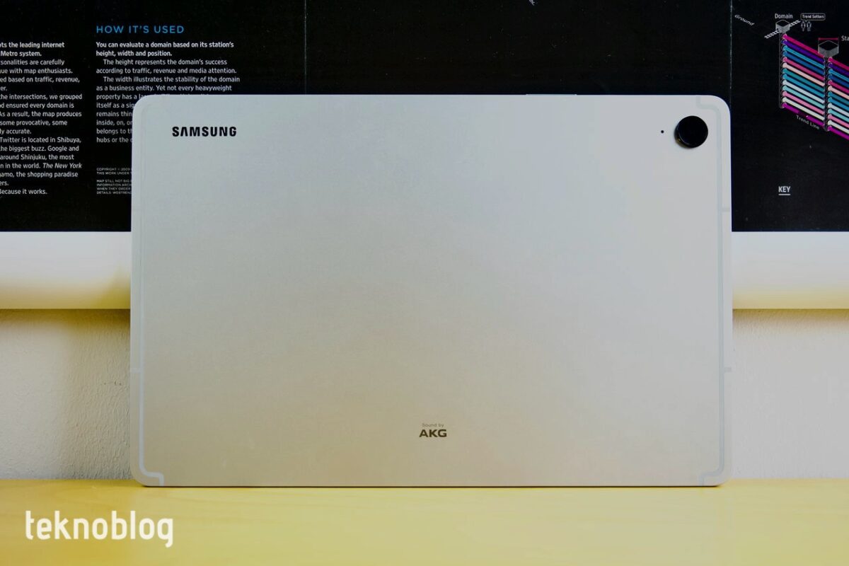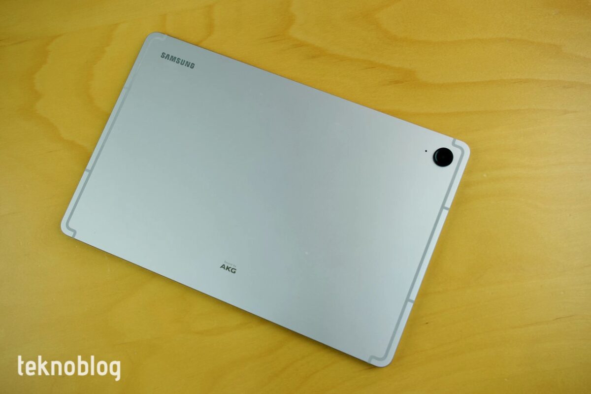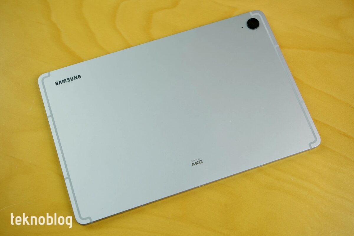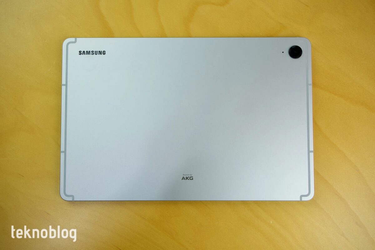 Arka tarafa baktığımızda, Galaxy Tab S9 serisinin diğer üyelerinde gördüğümüz S Pen yuvasının burada olmadığını görüyoruz. Yatay tutuşa göre yapılan düzenlemede Samsung logosu, onunla aynı doğrultuda kamera ve mikrofon var. Anten çizgileri de arkada hoş bir düzen oluşturuyor. Alt kenara doğru da, tabletin ses sistemine güç veren AKG’nin logosunu görüyoruz.