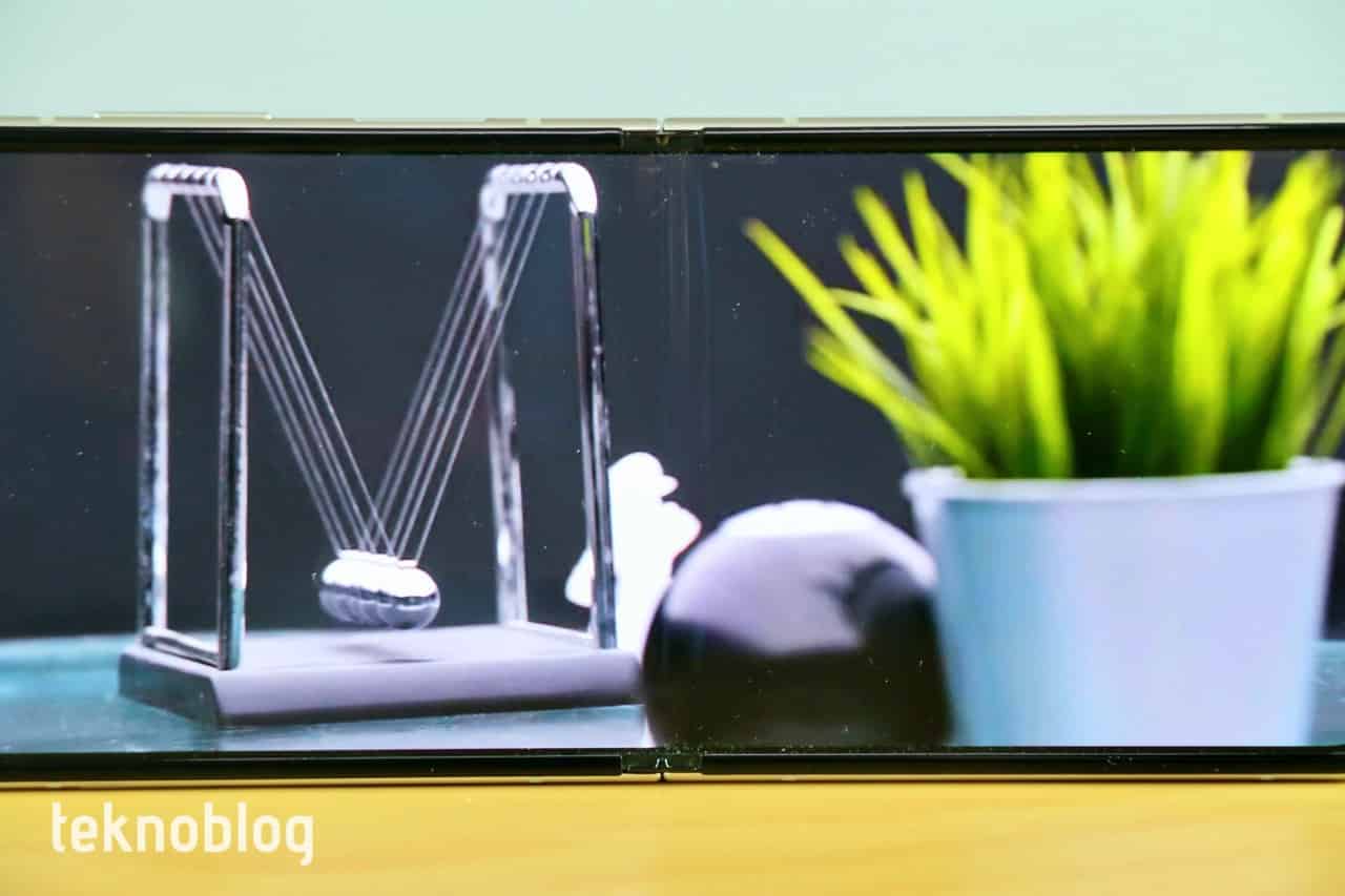 Bu arada ekranın üst kısmında selfie kamera deliği var. Yani karşımızda Samsung’un Sonsuz-O olarak adlandırdığı türden bir ekran bulunuyor. Katlanabilir bir telefon olduğu için, ekranın ortasında, menteşenin bulunduğu doğrultuda bir kırışıklık oluşuyor. Bu kırışıklık çok derin değil, optimum uzaklıktan, tam karşıdan bakarken çok fazla belli olmuyor. Ancak ekrana ışık yansıdığında veya koyu tonlu görüntülerin ön planda olduğu durumlarda biraz daha fark ediliyor. Her şeye rağmen, genel görsel deneyime çok büyük olumsuzluklarının olmadığını söyleyebiliriz. Bir süre sonra bu kırışıklığa alışacaksınız ve sizi çok rahatsız etmeyecek.