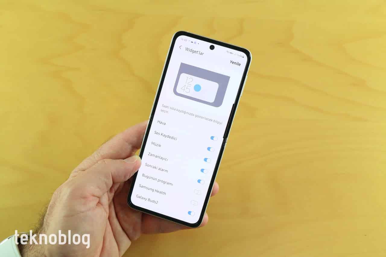 Yukarıda belirttiğimiz gibi, arkadaki kameraların hemen yanında ikinci bir kamera var. Bu kamera da 1.9 inçlik köşeden köşeye uzunluğuyla geçen yılın telefonundaki kapak ekranından hatırı sayılır oranda daha büyük. Çözünürlük de 260 x 512 pikselle hatırı sayılır miktarda artırılmış. Super AMOLED ekranın her türlü ışık koşulu altında yeterli bir görüş sunduğunu görüyoruz. Saati görmek istediğinizde ekrana çift tıklatmanız yeterli. Bunun yanı sıra ekranda gelen bildirimleri simge hâlinde görebilirsiniz. Bu ekran dokunmatik hareketleri de destekliyor. Yukarıdan aşağı sürükleyerek ses ve parlaklık ayarını yapabilirsiniz. Sola doğru sürükleyince bildirimler gösteriliyor. Sola sürükleyerek çeşitli widget’lar arasında gezinebilirsiniz. Müzik, takvim, Samsung Health, Galaxy Buds 2 kontrolleri, alarm, ses kaydedici gibi widget’lar var. Ayarlar bölümünden kapak ekranında hangi widget’ların görüntüleneceğini belirleyebilirsiniz. Öte yandan kapak ekranındaki saatin stilini ve duvar kağıdını da Ayarlar içinden özelleştirebilirsiniz. Yukarıdaki kullanımlara ek olarak, Z Flip 3’ün kapak ekranı selfie fotoğraf çekmek için de oldukça kullanışlı oluyor. Kapağı kaldırmadan, güç düğmesine iki kez art arda basarak kilit ekranında kamera vizörünü açabilir ve hemen çekim yapabilirsiniz.