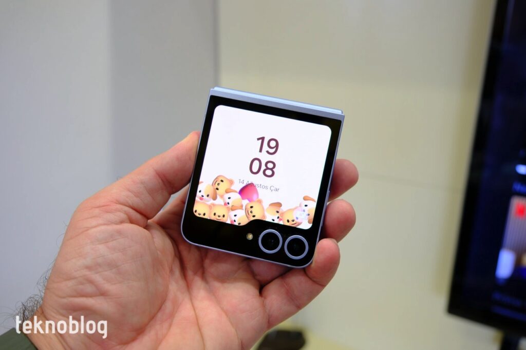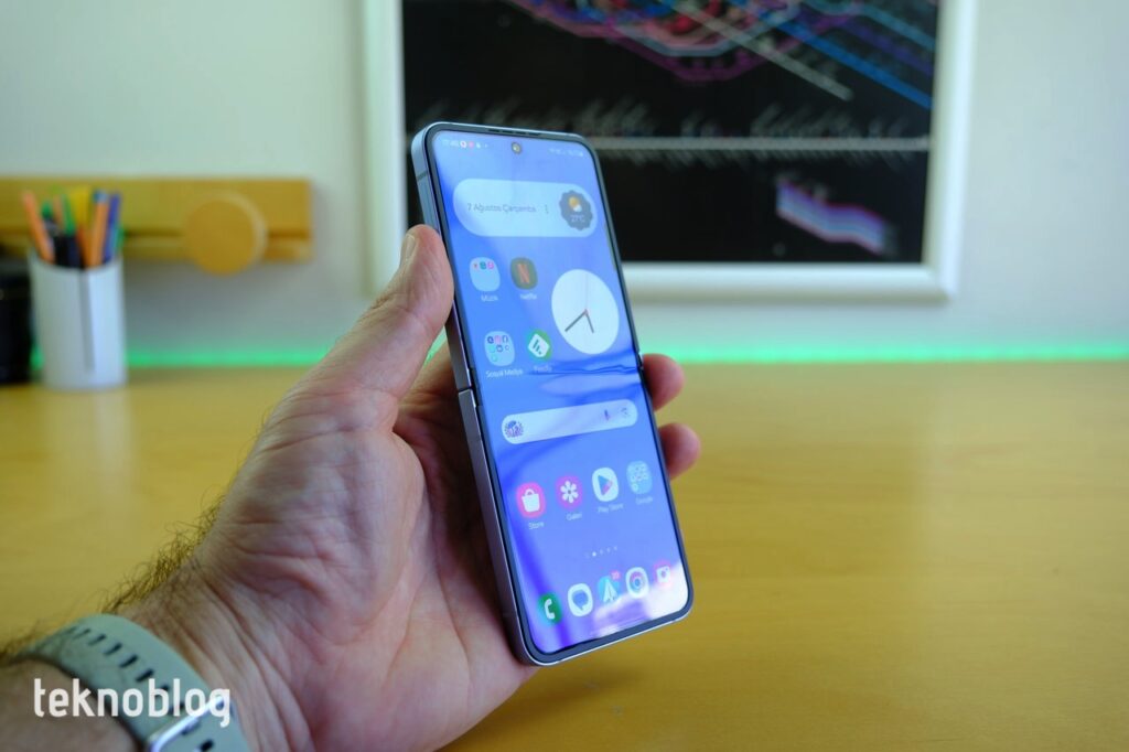 Galaxy Z Flip 6, görünüş itibarıyla selefi Z Flip 5’ten çok farklı görünmüyor. Boyutlar da hemen hemen aynı tutulmuş. Açık hâldeyken en, boy ve kalınlık gibi değerler aynı. Kapalı durumdayken ise çok az daha ince, bunu biraz daha da iyileştirilmiş menteşe mekanizmasına borçluyuz. Yine geçen yılın modelinde olduğu gibi, kapalı hâldeyken arada herhangi bir boşluk yok. Bunun en büyük yararı da cepte veya çantada taşırken araya herhangi bir toz veya zerreceğin kaçma ihtimalinin azalması. Z Flip 6’nın kapağını her açtığımda, menteşe bölümüne denk gelen yerde az bir toz tabakası gördüm. Halbuki daha eski modellerde, içerideki katlanabilir ekranın üstünde biriken toz daha fazlaydı.