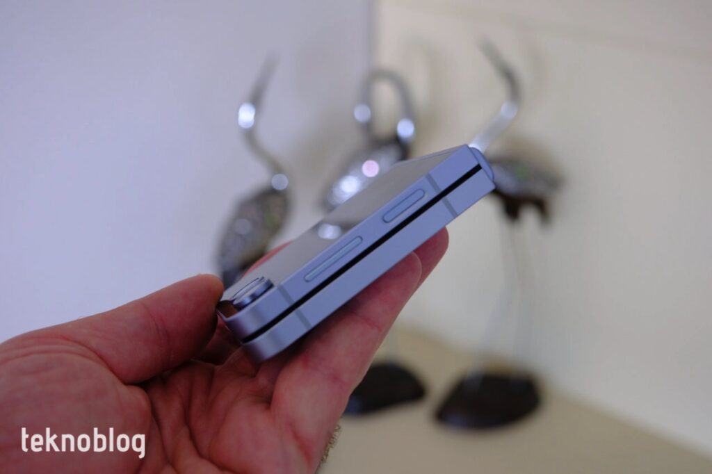 Telefonun üstündeki giriş ve çıkış birimlerine baktığımızda, bunlarda pek değişiklik yok. Alt kenarda USB-C portu, hoparlör ve mikrofon var. Üst kenarda da ikinci bir mikrofon var. Telefon kapalı durumdayken bu iki mikrofon da alt kenara bakıyor. Sağ kenarda ses tuşları ve güç düğmesi var. Telefonun katlanabilir yapısı nedeniyle, bunlar telefon açık hâldeyken normal bir akıllı telefona göre biraz daha üst konumda duruyor. Bu nedenle, özellikle sesi açıp kapatırken telefonu avuç içinizde hareket ettirmeniz gerekebilir. Güç düğmesine parmak izi okuyucu yerleştirilmiş. Bu birimi telefon hem kapalı hem de açık hâldeyken rahatlıkla kullanabiliyorsunuz. SIM kart tepsisi sol kenarda ve burada sadece bir tane fiziksel SIM için yer var. microSD kart yuvası yok. Telefon açıldığında arkaya, kapalı durumdayken öne gelecek şekilde iki tane kamera mevcut. Hemen yanda ise flaş var. Kapalı hâldeyken öne bakan kapak bölümünde ise 3.4 inçlik kapak ekranı bulunuyor. Bu ekran, kamera ve flaşın dışında kalan her alanı neredeyse tamamen sarıyor.