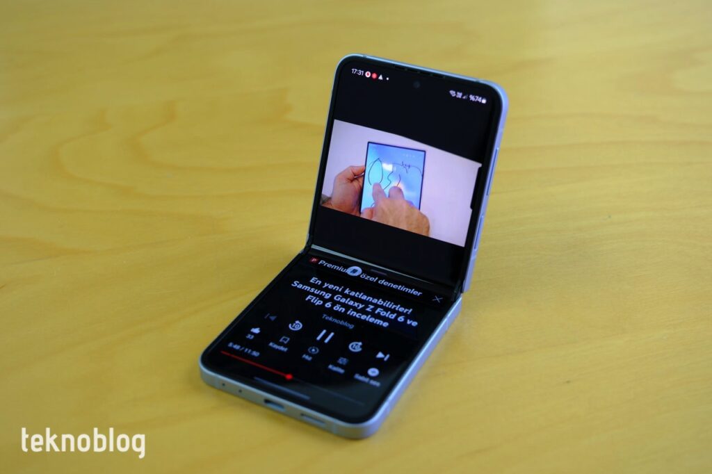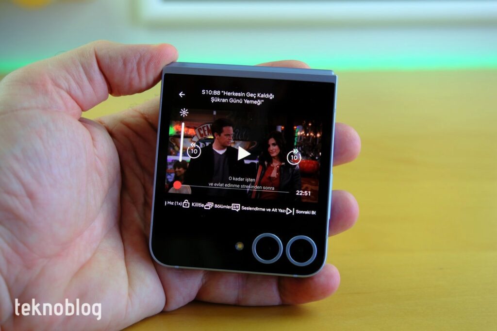Z Flip 6’nın katlanabilir ekranını ince ve uzun olduğu için, telefonu yatay biçimde tutup tam ekranda video izlediğinizde, videoların büyük çoğunluğunun 16:9 oranında olduğunu göz önünde bulundurursak, iki tarafta kalın siyah çubuklar göreceksiniz. Ancak Netflix veya bunun gibi platformlarda, 21:9 sinema formatındaki içerikleri izlerseniz, bu gibi içerikler ekrana hemen hemen tamamen uyacaktır. Bu da hareket hâlindeyken iyi bir sinema keyfi yaşamanızı sağlar. HDR10+ desteğiyle birleştiğinde, multimedya keyfi daha da artıyor. Ekranın derin siyahları ve canlı renklerinin de buna büyük katkısı oluyor.