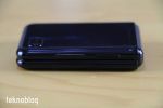Z Flip’in kenarında üst plakasında sağ kenara ses tuşları ve güç butonu yerleştirilmiş. Güç butonunda parmak izi okuyucusu mevcut. Alt kenarda USB-C portu, mikrofon ve hoparlör var. Nano SIM kart yuvası ise solda, üste doğru konumlandırılmış. Üstte de ikinci bir mikrofon var. Ana ekranın üst kısmında, çerçeve üstüne ahize hoparlörü bulunuyor. Arka tarafta iki adet kamera, yatay biçimde, hafif çıkıntı yapan bir modülde sıralanmış. Bunların yanında flaş var. Flaşın yanında da ikinci ekranı görüyoruz. Galaxy Z Flip’in siyah ve mor olmak üzere iki renk seçeneği ülkemizde satılıyor. Siyah biraz daha klasik, mor ise daha fazla dikkat çekecektir.