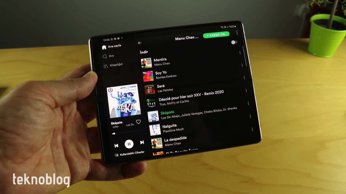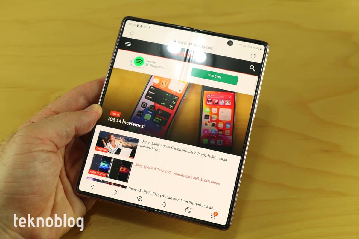 Diğer uygulamalarda ise özellikle içteki ekrana destek uygulamadan uygulamaya değişiklik gösteriyor. Burada iş çoğunlukla geliştiricilere düşüyor. Örneğin Instagram uygulamasında ekranın her iki yanında büyük boşluklar var. Twitter ve Facebook ise telefon görünümünü büyük ekrana yayma yoluna gidiyor. Bazı uygulamalar ise ilk kez büyük ekranda açıldığında çalışmıyor, öncelikle kapak ekranında açılması gerekiyor. Spotify ve bunun gibi bazı uygulamaların ise tablet görünümlerini güzel şekilde sunduğunu görüyoruz. Her geliştirici 20 bin TL gibi yüksek fiyata sahip olan ve geniş bir kullanıcı kitlesine ulaşmayacak cihaz için özel çalışma yapar mı? Eğer Samsung uygulama desteğini artırmak istiyorsa, bu özel formu için daha fazla geliştiriciyi ikna etmeli. Ya da şirket olayları akışına bırakmalı, katlanabilir formdaki cihazların popüler hâle gelmesini ve geliştiricilerin de kendiliğinden ilgi göstermesini beklemeli.