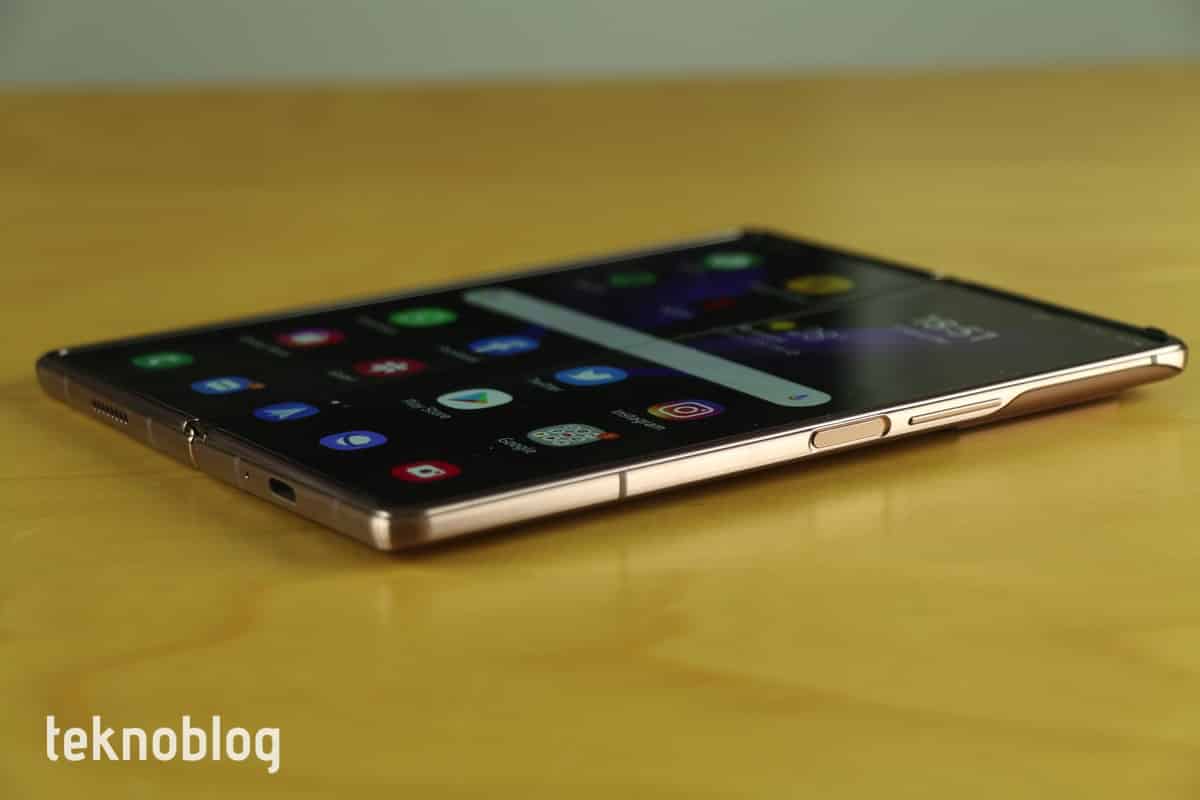 Kapalı durumdayken iki kanat arasında konik biçiminde bir boşluk var. Samsung’un yer verdiği sağlam menteşe yapısına ve ekran koruyucu filmi kenarlara kadar uzatıp bir de içteki ekranla koruma altına almasına rağmen telefonu mümkün olduğu kadar küçük ve sert parçacıkların olmadığı ceplerde veya çanta gözlerinde taşımaya gayret edin. Söz menteşe yapısından açılmışken, Z Flip’teki sağlam ve ekranın farklı açılarda açılıp kararlı biçimde durmasına izin veren menteşe yapısının daha uzun formu Z Fold 2’de bulunuyor. Bu sayede Z Fold 2 de Esnek Mod olarak adlandırılan farklı biçimlerde, farklı kullanım senaryoları için elverişli durumlar oluşturuyor. Esnek mod sayesinde selfie çekme, video izleme, fotoğraf ve video çekimi yapma veya görüntülü görüşme daha kolay hâle geliyor. İçerideki katlanabilir ekran iki parçaya ayrılıyor. Bir kısmında görüntü, diğer kısmında ise kontroller gösteriliyor. Örneğin yemek yerken bir şeyler izlemek isterseniz ve yanınızda stand yoksa, Z Fold 2’yi katlayarak daha küçük bir ekranda dilediğinizi isteyebilirsiniz. Ne var ki, bu şekilde bir seyir zevki tatmin etmiyor. Bir şeyler izlemek istiyorsanız, yanınızda bir stand bulundurmanızı ve içerideki ekranda daha büyük görüntü alanının tadını çıkararak izlemenizi tavsiye ederiz.