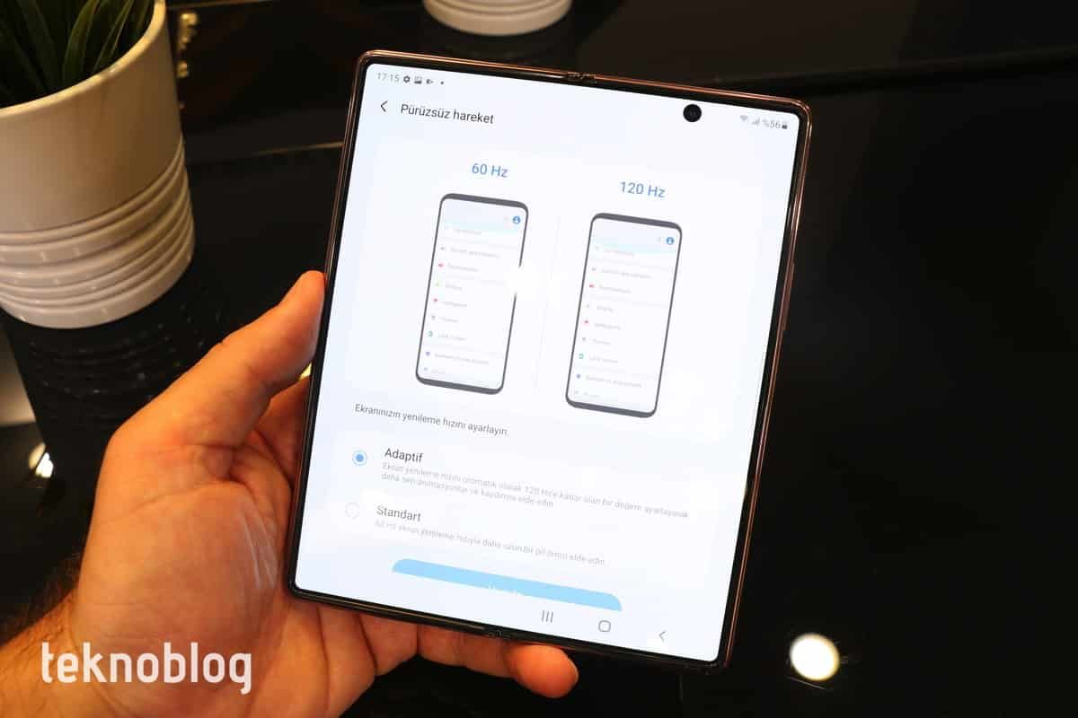 Büyüklüğü 7.6 inçe çıkan ekran yüksek parlaklığa sahip. Keskinlik ve netlik de yeterli. Ultra ince cam kullanıldığı için cam ekranları kullanma hissi de yaşanıyor. Ekranın ortasındaki kırışıklık karşıdan bakıldığında çok fark edilmiyor. Ya yanlardan bakmanız ya da ekrana ışık düşmesi ve yansıma yapması gerekiyor. Kısacası, Galaxy Z Fold 2 açılır hâlde bir tablet deneyimi yaşatma konusunda iyi bir performans sergiliyor. İçteki ekranda 120 Hz yenileme hızı desteği var, ancak Z Fold 2 ekran hızını içeriğe göre ayarlıyor. Aynı şekilde çözünürlüğün belirlenmesi de otomatik şekilde yapılıyor. Kullanıcıya içteki ekranın çözünürlüğünü değiştirme imkanı sunulmuyor.