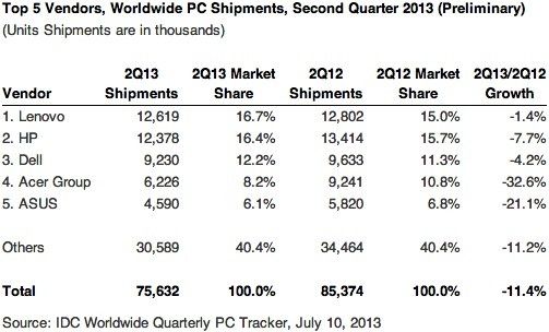 2013’ün ilk çeyreğini pek de iyi kapatmayan PC pazarı için işler yılın ikinci çeyreğinde de değişmiyor. Gartner ve IDC tarafından yayınlanan öngörülere göre, PC sevkiyatları bir önceki yılın ikinci çeyreğine göre yüzde 11 geriliyor. Her iki araştırma şirketi de düşüşü Avrupa ve Çin’deki düşük talebe ve tabletlerin giriş seviyesi bilgisayarlara tercih edilmesine bağlıyor.
