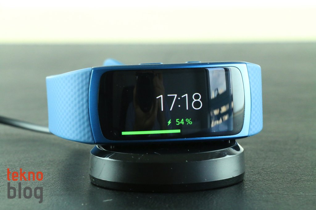 Samsung Gear Fit 2’nin içinde 200 mAh kapasiteli bir pil bulunuyor. Samsung’un belirttiğine göre, bu pil normal kullanımda üç ile dört gün, daha da cimri şekilde kullanımda ise beş güne kadar çalışma ömrü sunuyor. Bizim deneyimlerimize göre, Gear Fit 2, ekran parlaklık seviyesinin 7 olduğu, bağlı akıllı telefon ile etkileşimin sürekli etkin olduğu, otomatik algılama ve dahili GPS özelliklerinin sürekli açık olduğu ortamda 3 güne varan bir çalışma ömrü sunuyor. Gear Fit 2, kutusundan çıkan özel bir şarj aksesuarı ile şarj ediliyor. Bir beşik şeklindeki bu yuva, Fit2’nin arkasında bulunan manyetik bağlantılar sayesinde akıllı bileklikle buluşuyor. Şarj işlemi yaklaşık bir saat içinde tamamlanıyor. Bu özel aksesuar şarj sırasında saati yatay yönde de gösteriyor. Bu hâliyle Gear Fit 2 bir gece saati gibi de kullanılabilir.