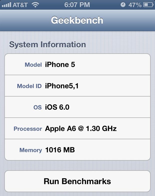 Apple’ın iPhone 5’inde yer alan çift çekirdekli Apple A6 işlemcinin 1 GHz civarında bir çalışma frekansına sahip olduğu biliniyordu. Gerçekleştirilen ilk inceleme ve performans testleri de bunu destekler niteliklerdi. Ancak Geekbench uygulamasının 2.3.6 numaralı yeni versiyonuna göre farklı bir durum söz konusu.