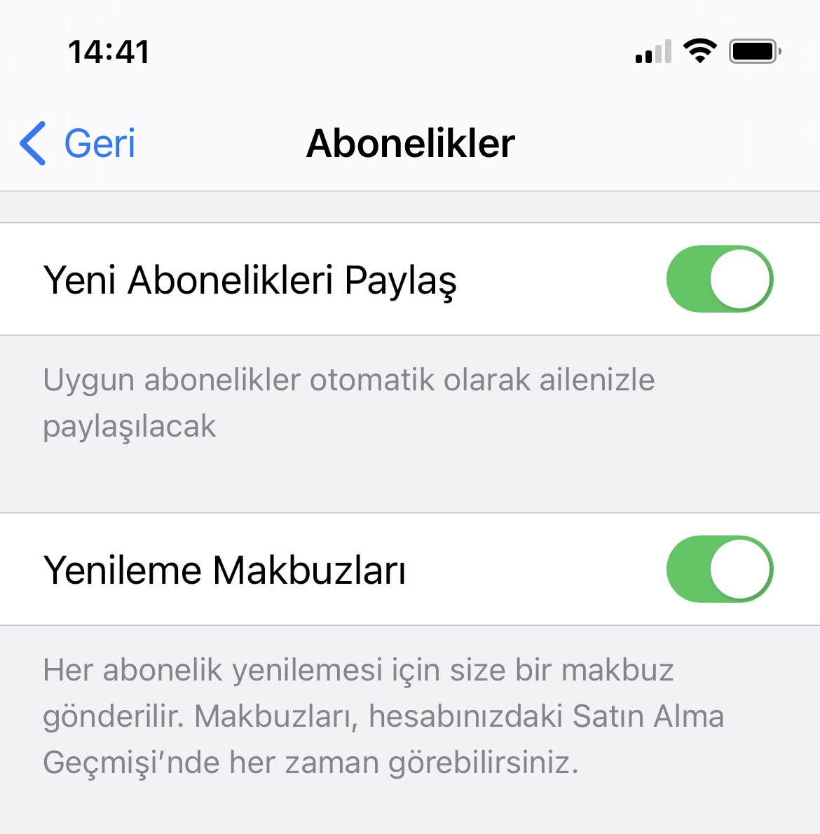 Ailede abonelikleri satın alan kişi sizseniz, Ayarlar‘a gidip en tepede bulunan Adınıza tıklatarak aboneliklerden hangilerinin paylaşma seçeneğine sahip olduğunu kontrol edebilirsiniz. Hesap sayfanızda bulunan Abonelikler seçeneğine dokunun.