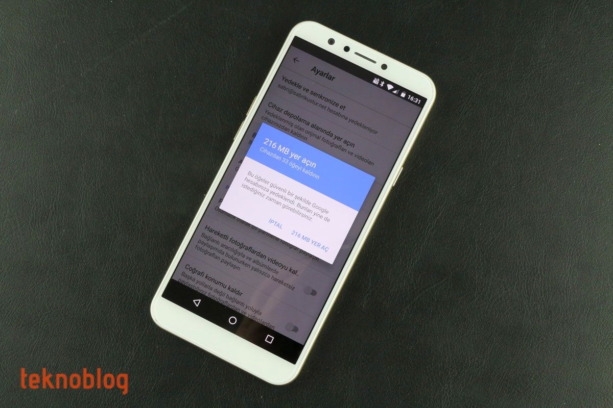 İçerideki donanım bileşenlerine baktığımızda, GM 8 Android One’da Qualcomm’un 1.4 GHz, sekiz çekirdekli 64-bit Snapdragon 435 işlemcisinin yer aldığını görüyoruz. Elimizdeki modelde 3 GB RAM ve 32 GB dahili hafıza bulunuyor. Aynı zamanda GM 8’in 4 GB RAM ve 64 GB dahili hafızalı versiyonu da bulunuyor. microSD kart yuvasıyla depolama alanını daha da genişletmek mümkün, ancak mevcut durumda 32 GB’ın bile GM 8 için yeterli olduğunu söyleyebiliriz. Fotoğrafları ve videoları Google Fotoğraflar’a ücretsiz olarak depolama imkanı var ki, buna birazdan değineceğiz.