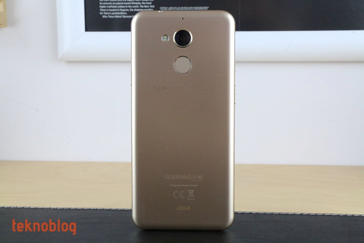 GM 8’in pürüzsüz arka yüzü gümüş veya altın renk seçeneklerle geliyor. Bunu beyaz renkli ön yüz tamamlıyor. Elimizdeki altın renkli model epey şık duruyor ve göze hoş görünüyor. 13 megapiksel arka kamera, hemen yanında çift renkli flaşla birlikte yer alıyor. Bu ikilinin üstünde ise ikinci mikrofonu görüyoruz. Parmak izi okuyucusunun altında ise General Mobile logosu bulunurken, biraz daha altta da Android One logosunu görüyoruz. GM 8’in çıkarılabilir bir arka kapağı veya herhangi bir parçası bulunmuyor. Bu da pilin sabit olduğu ve kullanıcılar tarafından çıkarılamadığı anlamına geliyor.