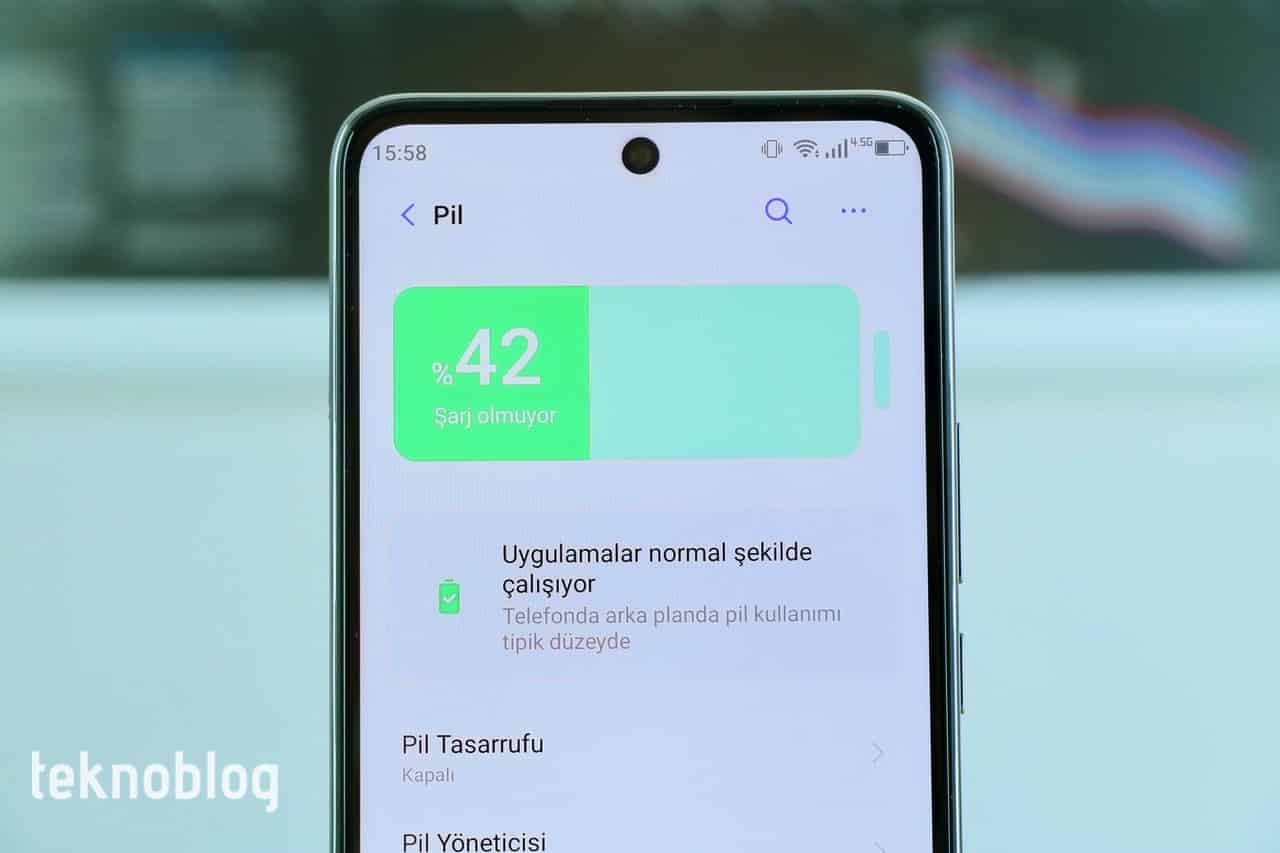 Akıllı telefonun kutusundan 15W şarj adaptörü çıkıyor. Bu adaptörle telefonun pili neredeyse boşken yaklaşık 140 dakika sonunda yüzde 100 doluluk oranına ulaşıyor.
