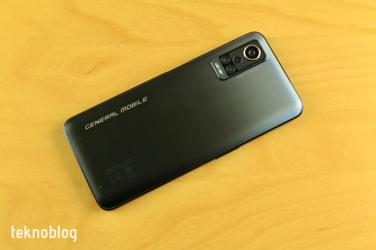 Arka tarafta ise telefonun yatay tutulduğunda bir fotoğraf makinesi gibi görünmesine imkan sağlayacak, genellikle Çinli üreticilerin telefonlarında gördüğümüz bir düzen görüyoruz. General Mobile logosu düşey eksende, telefon yatay tutulduğunda düz görünecek biçimde yerleştirilmiş. Bu logo doğrultusunda ise kamera modülü var. Burada dört tane kameranın olduğunu görüyoruz. Ana kamera diğerlerinden daha büyük bir alan kaplıyor. Ayrıca çift LED flaş var. Kamera modülünün hemen altında ise 108 megapiksel ana kameraya bir ibareyle atıf yapıldığını görüyoruz.