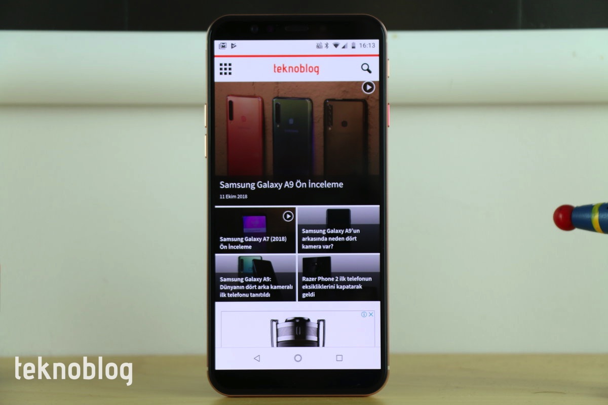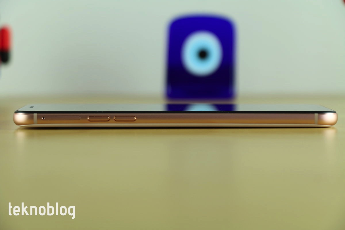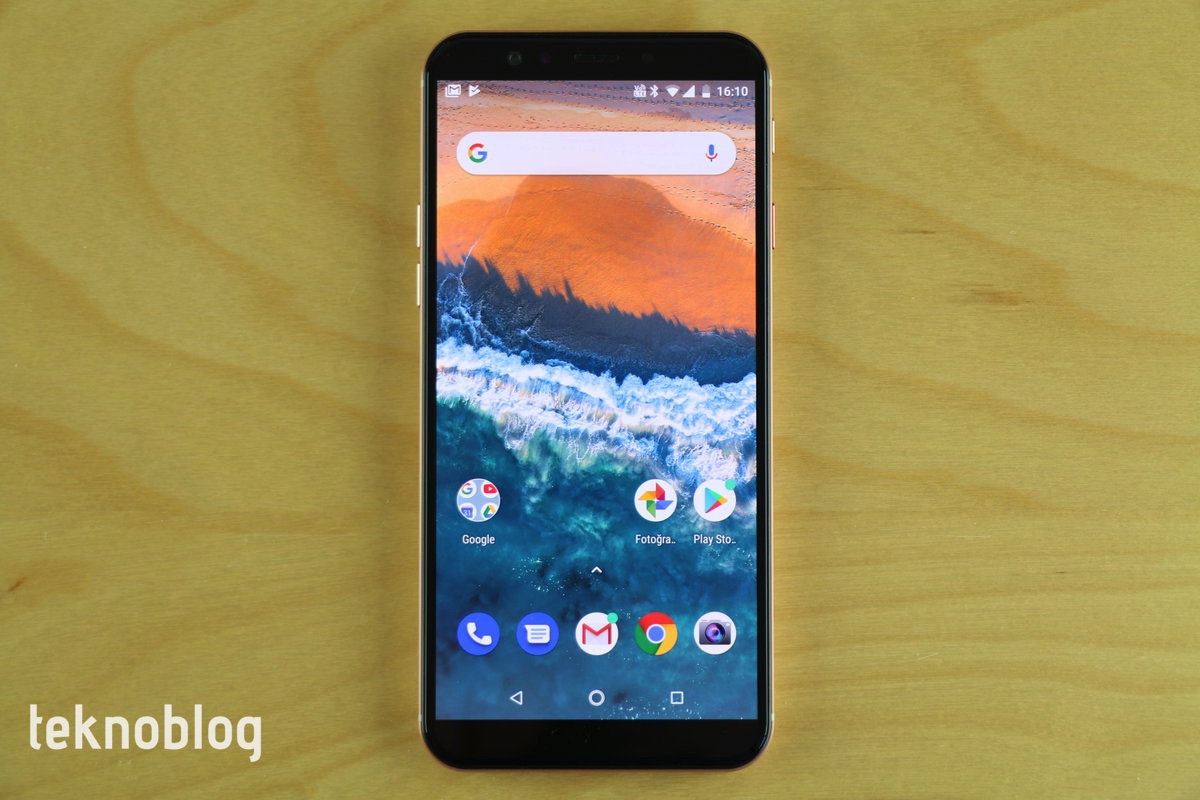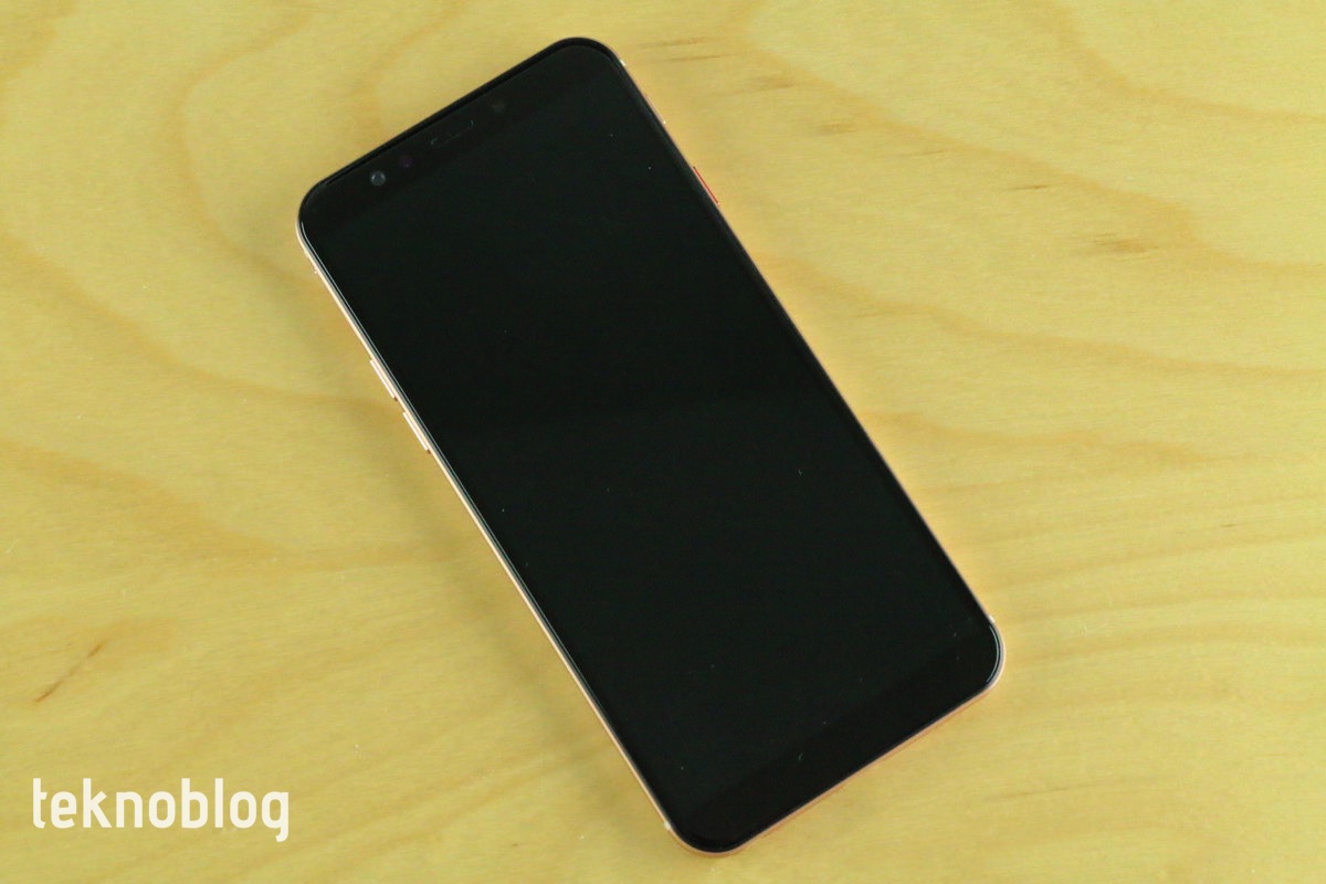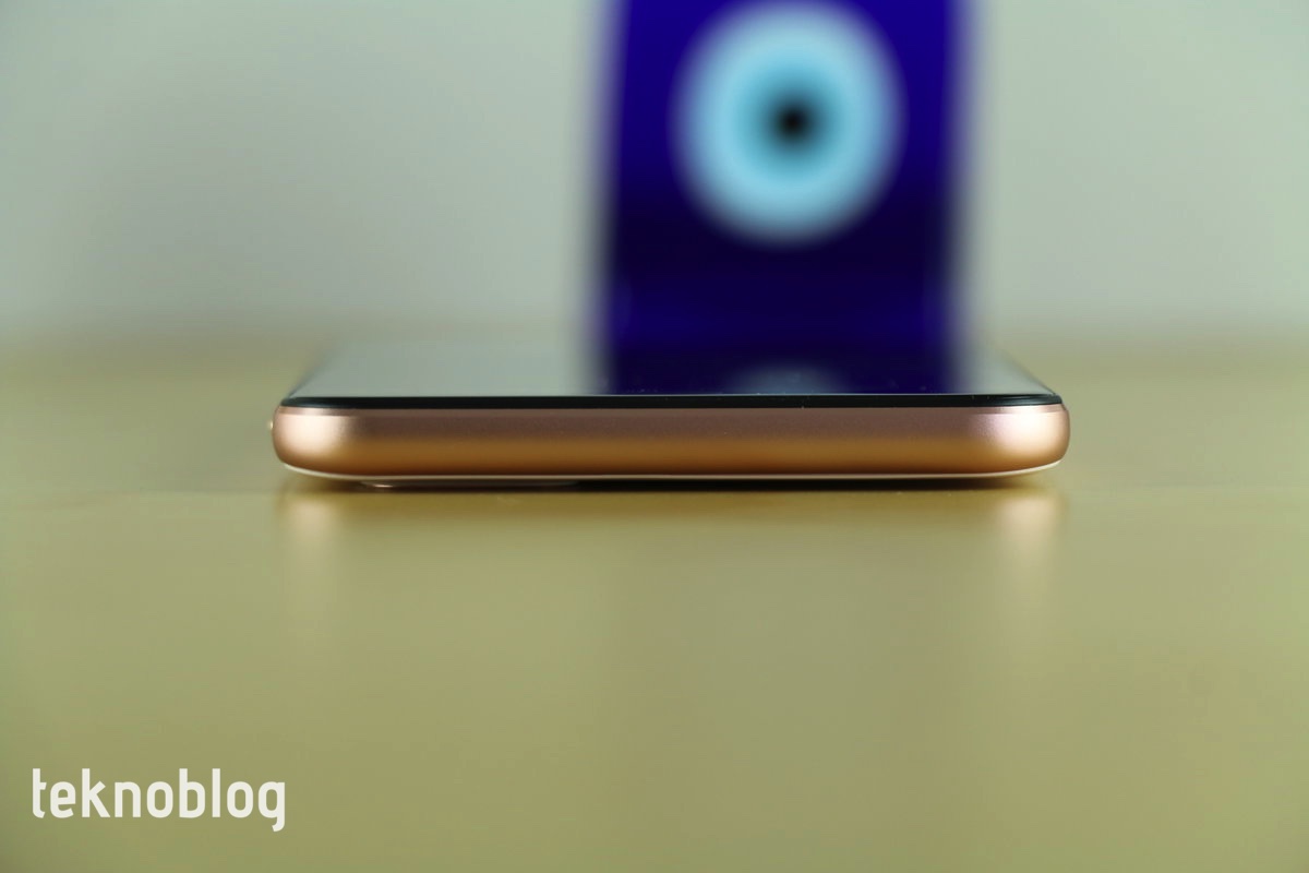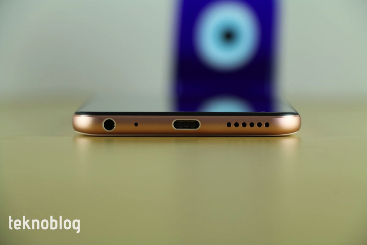 General Mobile 18:9 ekranlara uyum sağlasa da, çentik modasından şimdilik uzak duruyor. Ekranın üst ve alt kısımlarında nispeten geniş alanlar var. Üst tarafta ahize hoparlörü, ön kamera ve sensörler mevcut. Ekranın uzun kenarlarını saran çerçeveler ince, bu da telefonun enini büyütmüyor, rahat biçimde tutulmasını sağlıyor. Kenarları tamamen çevreleyen metal hattın üzerine baktığımızda, alt kısımda USB-C portu, 3.5 mm. kulaklık jakı ve hoparlörü görüyoruz. Ahize hoparlörüne yerleştirilmiş ikinci bir hoparlör de mevcut. Üst kenarda herhangi bir unsur yok. Sol tarafta microSD ve nanoSIM kart tepsisi ve ses tuşlarını görüyoruz.
