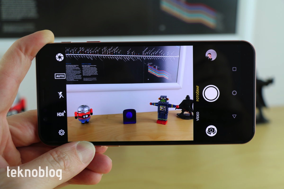 Öncelikle kamera özelliklerinden bahsedelim. Arkada 12 megapiksel ve 8 megapiksel çözünürlüklü iki adet kamera var. Ana kameranın f/1.8 diyafram açıklığı özelliği de var. Optik görüntü sabitleme yok, bunun yerine elektronik görüntü sabitleme özelliği bulunuyor. 1.4 mikronluk büyük piksel boyutu ve yüksek diyafram açıklığı birleşince, telefonun düşük ışıkta iyi bir performans sergilemesini bekliyoruz. Aynı zamanda otomatik HDR özelliği de mevcut.