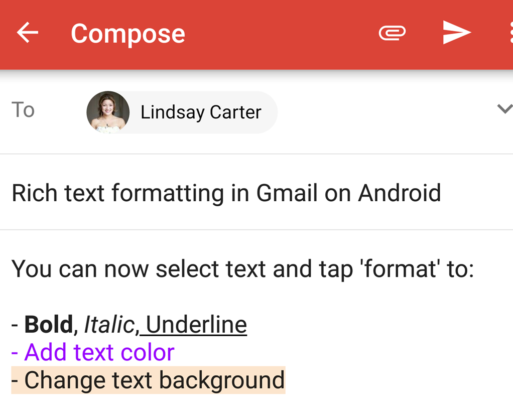 Güncellemeyle birlikte zengin metin biçimlendirme seçeneklerine kavuşan uygulamayla yazılan e-postalarda belli kelimeleri kalın, eğik veya altı çizili biçimde yazmak ve dikkati istenen noktaya çekmek mümkün olacak. Kullanıcılar diledikleri takdirde yazı veya arka plan rengini de değiştirebilecek.