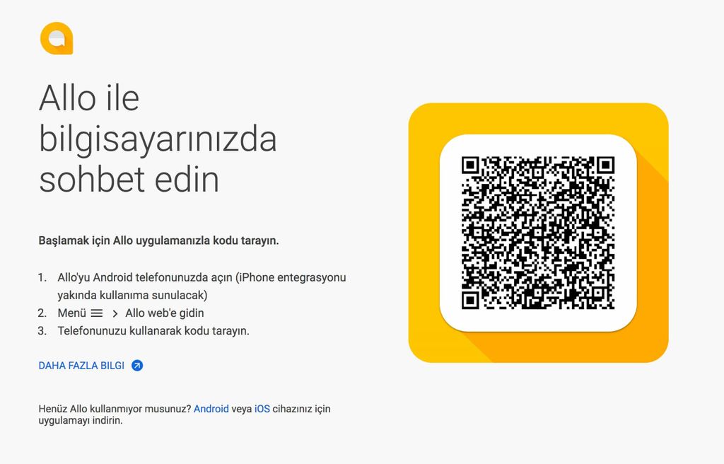 Şimdi birkaç ay sonra, bu özellik faaliyete geçti. WhatsApp Web gibi çalışan Allo web’i kullanmak için web sitesinde gördüğünüz QR kodu telefonunuzun kamerasıyla taratmanız yeterli oluyor. Şu an için sadece Android telefonları üzerinde çalışan Allo uygulaması destekliyor. Ancak iPhone’daki sohbetlerin de çok yakında masaüstüne yansıtılabileceği belirtiliyor.