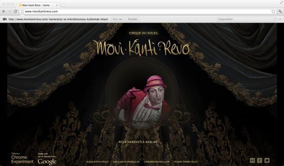 Cirque du Soleil’in ekibi tarfından tasarlanan ve Subatomatic Systems’in çalışmaları tarafından hazırlanan Movi.Kanti.Revo sitesi geleneksel HTML ve CSS uygulamalarının 3D geçişleri ve HTML API’leriyle birleştirilmesi sonucunda hazırlandı. Kullanıcılar da bilgisayarın web kamerası ve mikrofonu sayesinde Cirque du Soleil’in dünyasına bizzat katılma imkanı elde ediyor. Bu, WebRTC’nin bir özelliği olan ve Google Chrome’un da desteklediği getUserMedia bileşeni yardımıyla mümkün hâle geliyor. Web sitesine ilk kez girdiğinizde Chrome, bilgisayarınızın web kamerasına ve mikrofonuna erişim için izin istiyor. Siz inzi verdikten sonra kameranızın yardımıyla gizemli bir karakterin peşinden giderek Cirque du Soleil’in gerçek üstü dünyasındaki maceraları gerçek zamanlı şekilde yaşayabilirsiniz.