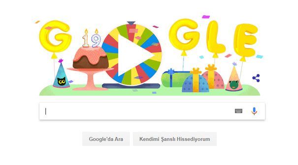 Google bundan 19 yıl önce 4 Eylül 1998’de kurulmuştu. Ancak şirket, 27 Eylül 2005’te rekor indeks sayısına ulaştığı için doğum günlerini 27 Eylül’de kutlamayı tercih ediyor. Google doğum günü çarkıfeleği ile 19. yaş gününü internet kullanıcılarıyla birlikte kutluyor.