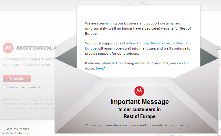 Bazı bölgesel siteler ziyaret edildiğinde ortaya çıkan mesaja göre, lokal destek siteleri faaliyetlerine devam edecek. Ancak, Motorola’nın iş ve destek sistemlerini yenilemek adına Asya, Avrupa, Orta Doğu ve Afrika, Hong Kong ve Tayvan siteleri kapatıldı. Bu kapatılan sitelerin yerini ise merkezileştirilmiş bir internet sitesi aldı. Google ve Motorola adına bu hamlenin daha olumlu olacağı belirtilse de, müşterilerin cephesinden bakıldığında durum pek de öyle gözükmüyor. Bölgesel sitelerin olmamasından ötürü hangi ürünün hangi bölgeyi hedeflediğinin kestirilmesinde sıkıntılar yaşanabileceği söylenirken, tüm dünyada satışta olmayan ürünlerin yanına bir yıldız işareti koyulacağı belirtildi.
