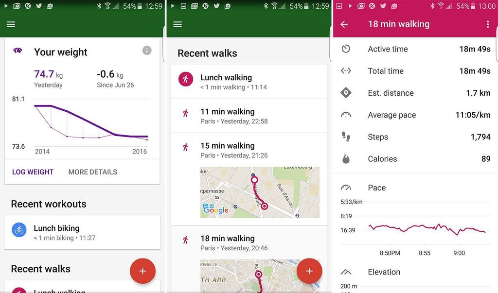 Google uygulamanın ana ekranına her hedef için ayrı bir kart ve kadran yerleştirmiş. Bu kartlar kullanıcıların neler yaptığını ve hedeflerine ulaşmaları için gereken süreyi gösteriyor. Aşağıya doğru inildiğinde kullanıcılar kilolarını, son egzersizlerini ve daha fazla bilgiyi görebilecek. Ekrandaki yüzen “+” butonu ise yeni hedefler belirlemeyi, kilo kaydı tutmayı ve aktivite eklemeyi sağlıyor.