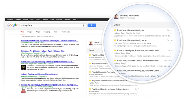 Gmail üzerinden sonuçlar web arama sonuçlarının yer aldığı sayfada, onların hemen sağında yer alan küçük bir kutu içinde gösteriliyor. Bu içerik varsayılanda açık gelmiyor, böylelikle sizin hemen yanı başınızda oturan bir kişinin sizin gizli nitelikteki elektronik posta iletilerinizi görmesinin önüne geçilmiş oluyor. Bunun yerine “sonuçları gör” bağlantısına tıklanarak sonuçlar açılıyor. Bu arada Google, Gmail üzerinde yer alan e-posta iletilerinin web arama sonuçlarıyla ilişkili olanlarının gösterilmesi özelliğinin kapsamını diğer Google servislerini kapsayacak şekilde genişletmeyi planlıyor. Google Drive üzerinde depolanan dosyaların sonuçlarla birlikte gösterilmesinin yanı sıra takvim kayıtlarının da web arama sonuçlarına iliştirilmesi özelliği de saha testine sunuldu.