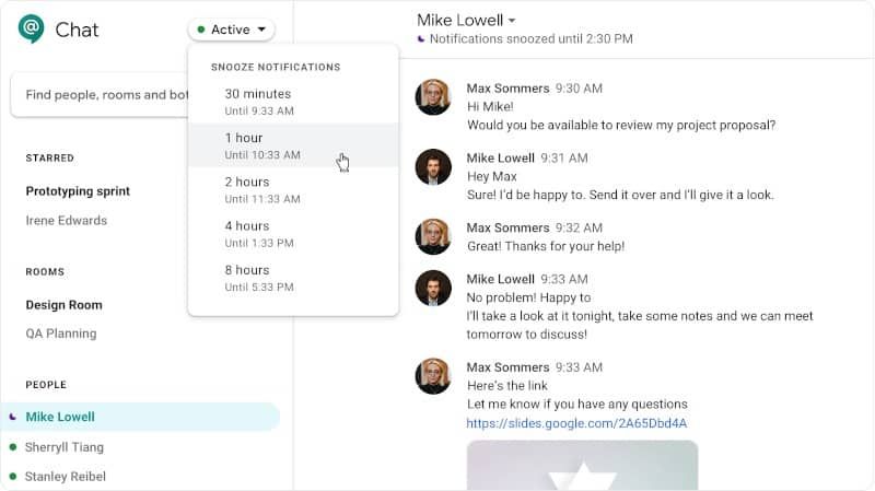 Bundan böyle Hangouts Chat kullanıcıları uygulamadan gelecek bildirimleri belli bir süre için erteleyebilecek. Bunun için uygulamadaki durum butonuna tıklamak ve açılan menüden “bildirimleri ertele” seçeneğini işaretlemek yeterli oluyor.