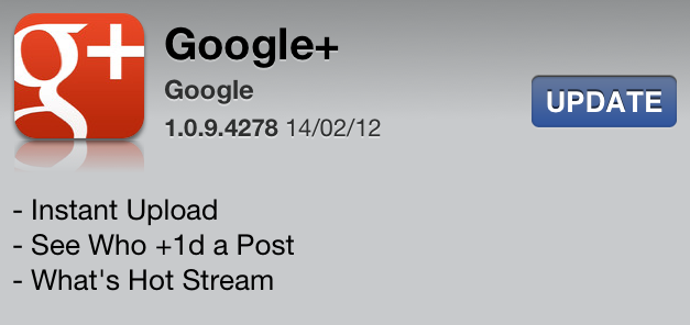 Google, sosyal ağının hem web hem de iOS platformunda bazı yenilikler yaptı. iOS uygulamasındaki en büyük değişiklik şimdiye kadar Android kullanıcılarının yararlanmakta olduğu hızlı fotoğraf yükleme özelliğinin eklenmesi oldu. Uygulamayı ilk kez yükledikten veya güncelledikten sonra Google+ kullanıcılara otomatik yüklemeleri açmak isteyip istemediklerini soruyor. Eğer cevap olumlu olursa bu sefer Wi-Fi ve 3G ya da sadece Wi-Fi seçeneklerinden bir tanesinin kullanılacak yükleme yöntemi olarak belirlenmesini istiyor.