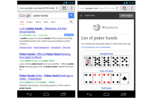 Aslında bu özelliği masaüstü arama sonuçlarında uzun zamandır görüyoruz, ancak söz konusu mobil ortam olduğunda bu bağlantıların eksikliği hissediliyordu. Bu arada Google yenilenmiş Hızlı Gözatma etiketlerini de duyurdu. Henüz test aşamasında olan bu proje Wikipedia’dan bağlantılar üretiyor, böylelikle arama sorgunuzla ilgili bilgileri görme fırsatına erişiyorsunuz. Yukarıdaki ekran görüntüsü söz konusu deneysel çalışmanın mantığını ortaya koyuyor. Hızlı Gözatma etiketleri şu an için sadece İngilizce versiyonda görüntüleniyor, ancak Google bu desteği farklı dildeki versiyonlara getirmek için çalışmalarını sürdürüyor.