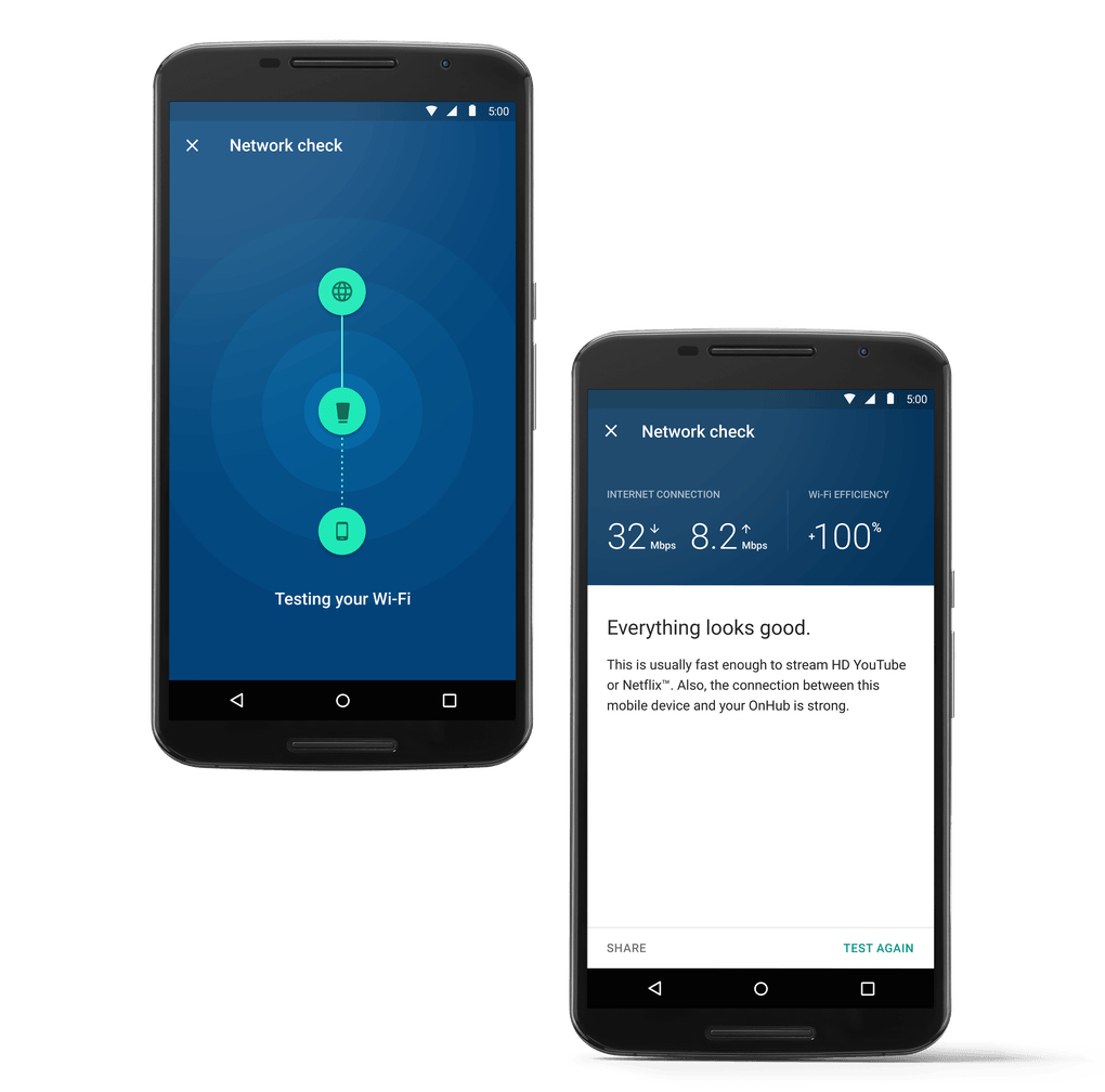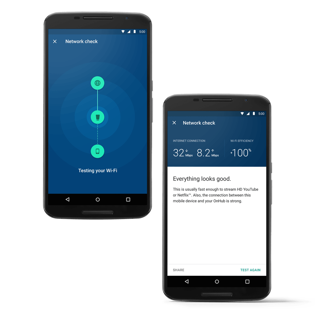 OnHub’ın müşterileri çekecek temel özelliği kolay kurulması ve hataları gidermede baş ağrıtmaması. iOS ve Android telefonlarına sade ve şık görünümlü bir uygulama sayesinde bağlanıyor. Uygulamayla OnHub’a kaç tane cihazın bağlandığını ve bunların hangi hızlardan yararlandığını görmek mümkün oluyor. Google ağ yönlendiricisinin silindirik tasarımının ev içinde daha iyi sinyal yayılımına olanak sağladığının altını çiziyor, cihaz içinde 13 farklı anten bulunuyor. Ayrıca ağ yönlendiricisi yayın yapılacak en iyi kanalı otomatik olarak seçiyor, 802.11ac ve 5 GHz Wi-Fi desteği de barındırıyor.