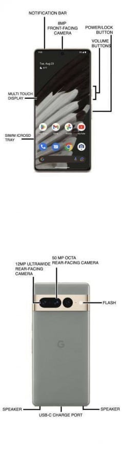Pixel telefonların ve yeni Pixel Watch’un “Cihazınız” bölümünde kullanım kılavuzunu bulmak mümkün oluyor. Burada cihazlar üzerindeki butonların işlevlerini öğrenmek mümkün oluyor. Kontrol şemaları, Google Pixel 7’de 8 megapiksel ön kameranın, 50 megapiksel ana kameranın ve 12 megapiksel ultra geniş açılı kameranın bulunduğunu doğruluyor.
