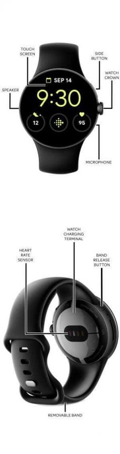 Pixel 7 Pro’nun ön kamera çözünürlüğünün de 8 megapiksel olarak gösterilmesi dikkat çekiyor. Dedikodulara göre telefonda 11 megapiksel ön kameranın bulunacak. Arka tarafta ise ana kamera çözünürlüğünün 50 megapiksel olduğu görülüyor. Pixel Watch’ta ise kurma kolu, buton ve mikrofon bulunuyor.