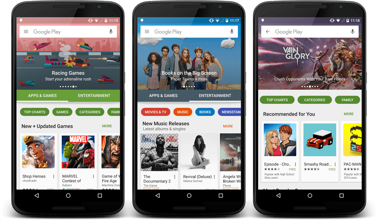 Yeni tasarımda Google Play Store’un iki ana bölüme ayrıldığı görülüyor. Bu bölümler Uygulamalar & Oyunlar ile Eğlence adını taşıyor. Halihazırda Google Play Store’da Uygulamalar, Oyunlar, Eğlence, Sinema & TV, Müzik, Kitaplar ve Gazetelik olmak üzere yedi bölüm bulunuyor.